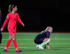 Berglind Björg liggur. Hún féll við eftir að hafa sent frá sér boltann. Líklega slæmur krampi.