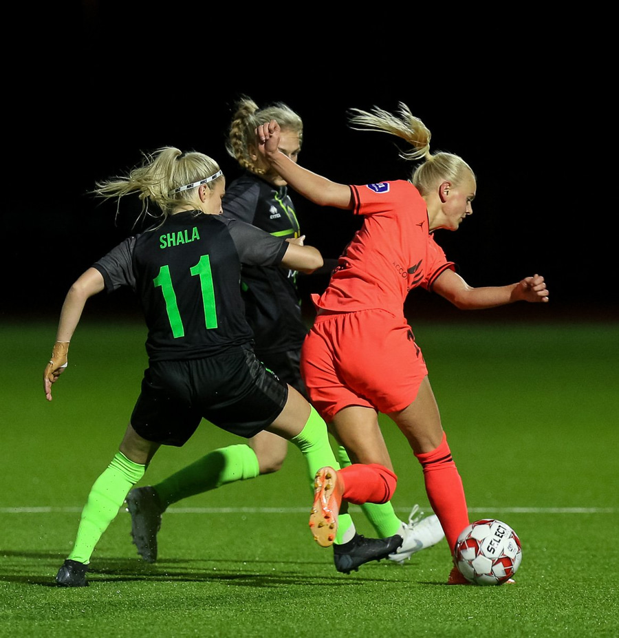 Sævik er nálægt því að bæta við marki. Fékk fyrirgjöf á fjær. Ásta Vigdís varði frá henni í fyrstu tilraun. Sævik fékk boltann svo aftur en ég sé ekki hvort það er stöngin eða Ásta sem bjargar í seinna skiptið.