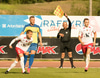 Grindvíkingar fá nú aukaspyrnu á góðum stað og Gunnar Þorsteinsson og Aron Jóhannsson standa yfir boltanum. Utarlega til hægri, hentar vinstri fæti Gunnars vel.