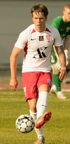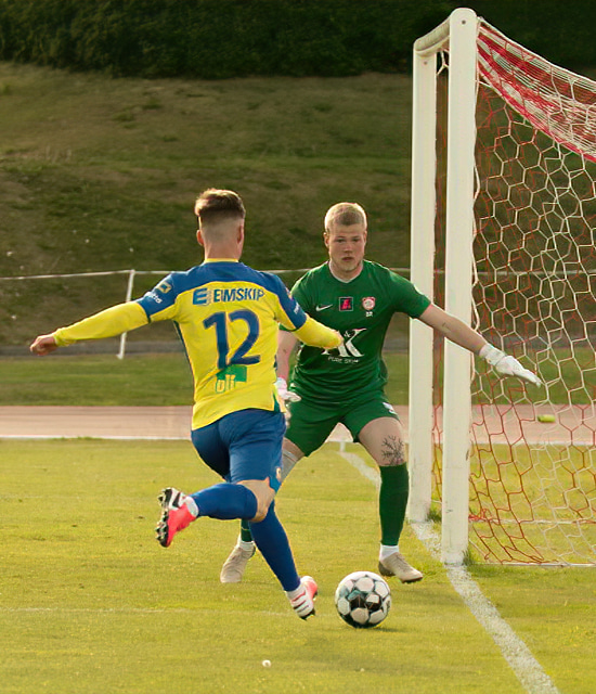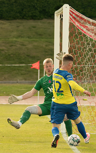 Oddur Ingi í góðu færi! Guðmundur Magnússon stingur boltanum inn á hann og hann er einn gegn Aroni Birki. En Aron sér við honum og ver boltann vel í horn!