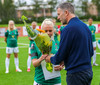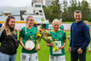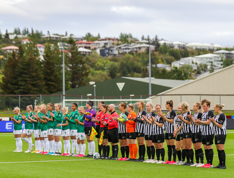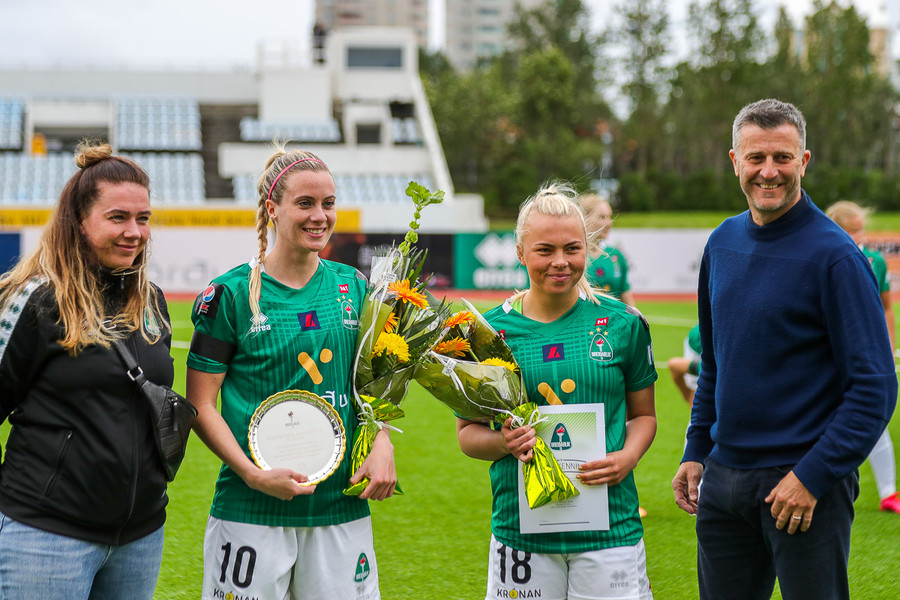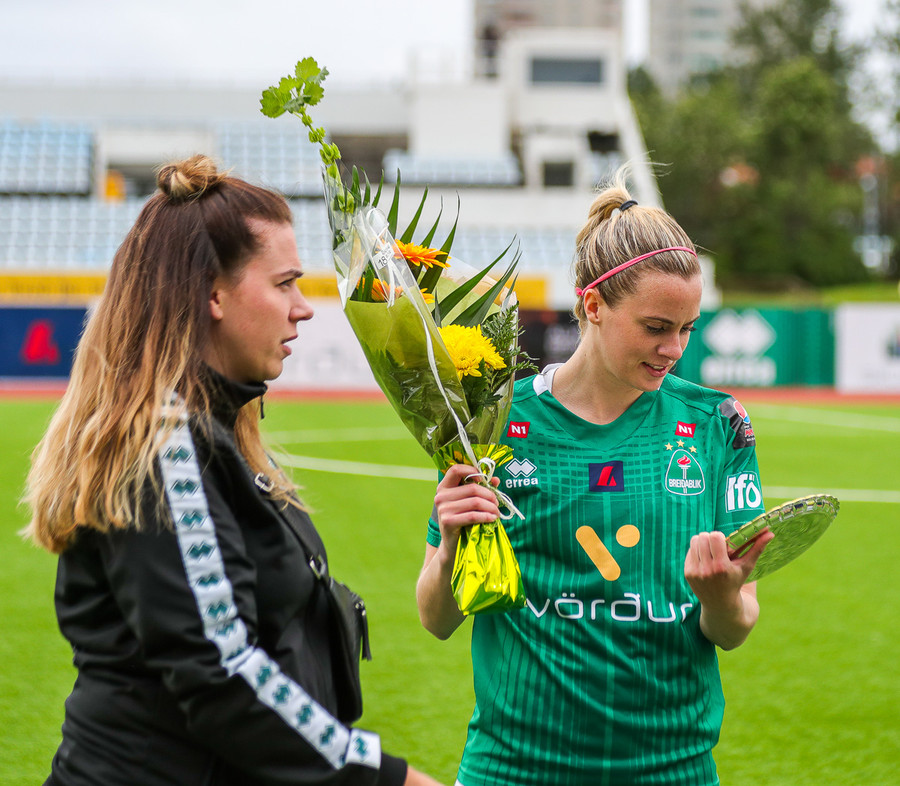 Tveir leikmenn Blika eru heiðraðar fyrir leik. Kristín Dís fær viðurkenningu fyrir 100 meistaraflokksleiki fyrir Breiðablik og Berglind Björg Þorvaldsdóttir fær glæsilegan platta fyrir 200 leiki fyrir klúbbinn.