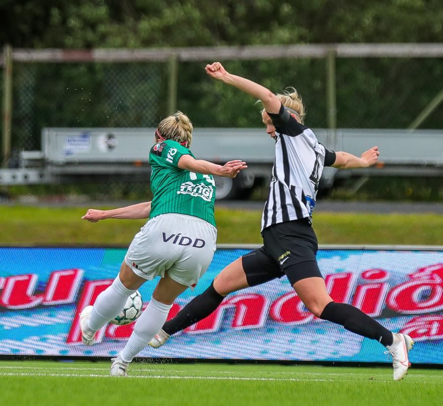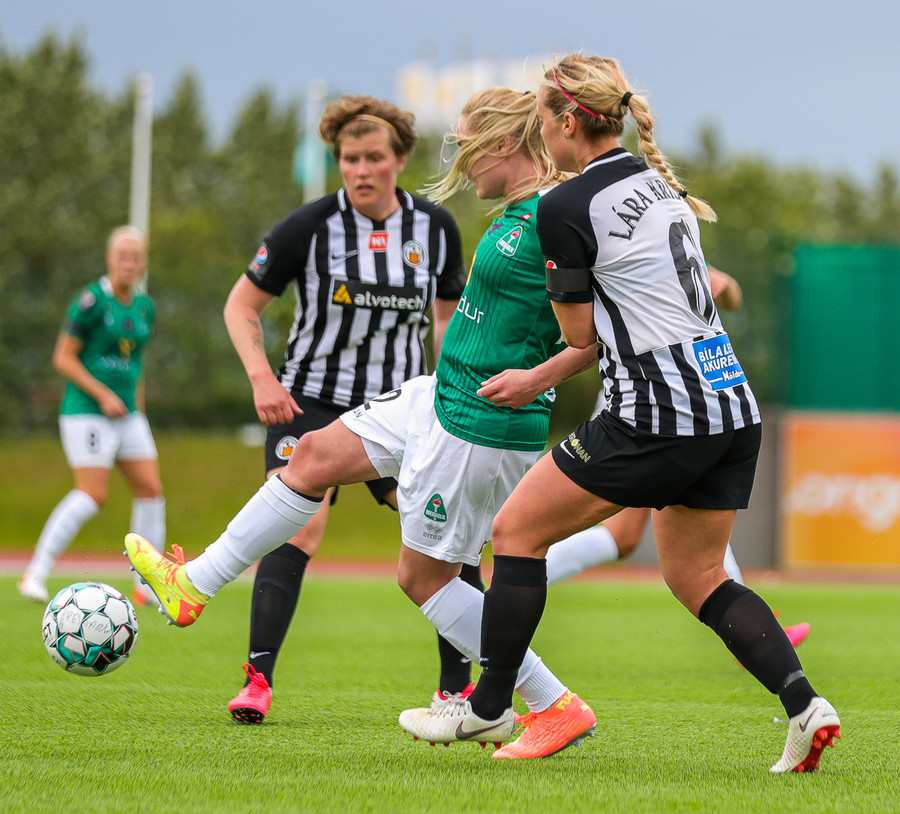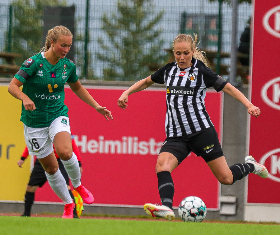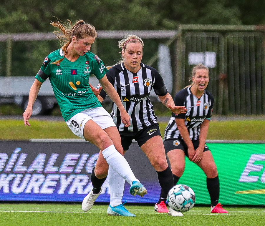 Hættulegt. Berglind kemst upp að endalínu vinstra megin og sendir fastan bolta fyrir. Kristín Erla hreinsar af fjærsvæðinu.