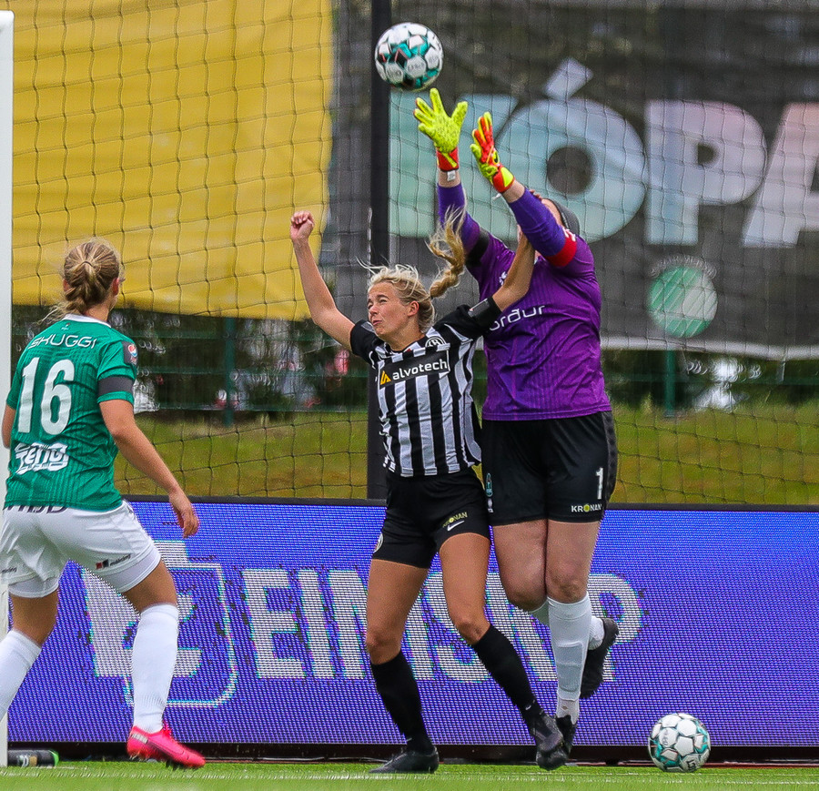 Hornspyrnan sjálf er hinsvegar áreynsluminni fyrir Sonný sem stígur eitt einfalt skref út í teiginn og grípur boltann.