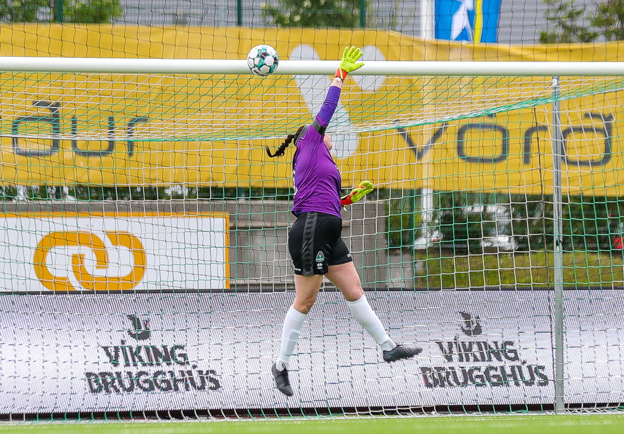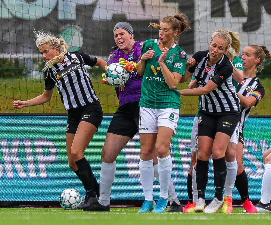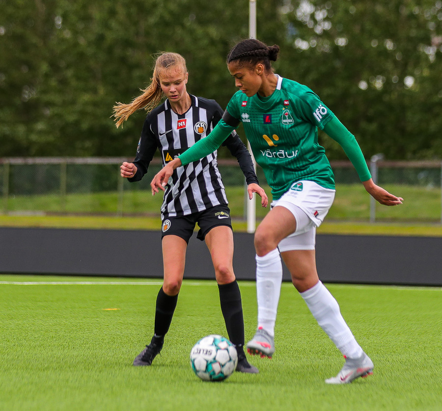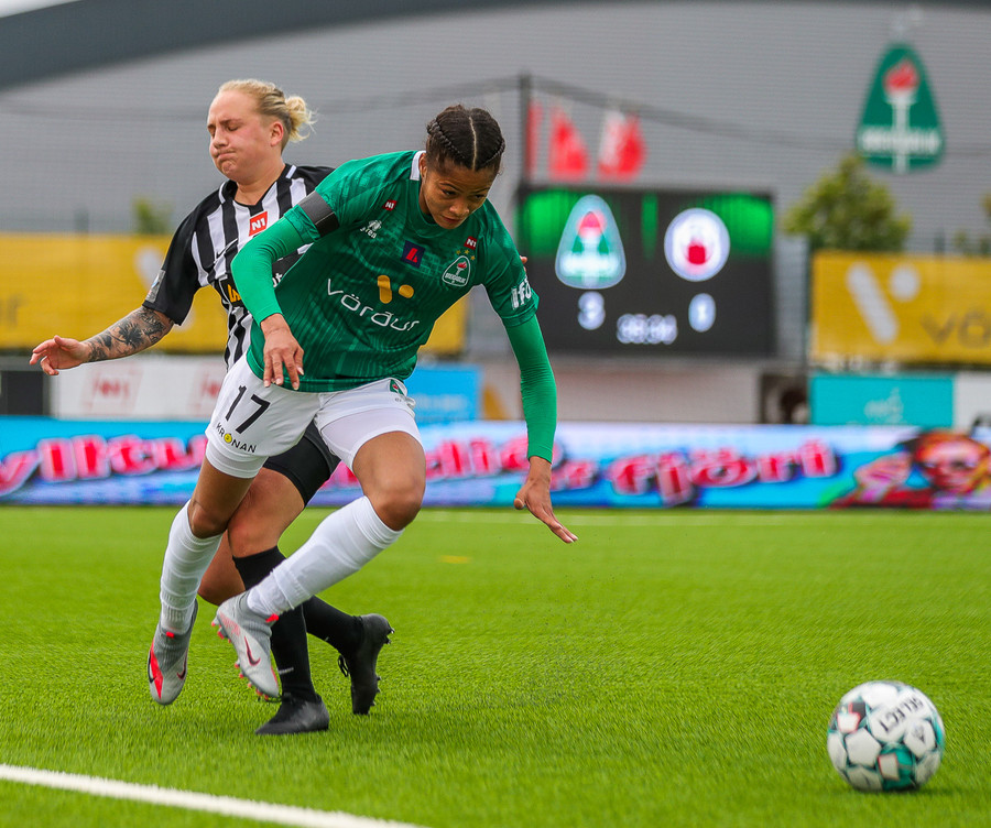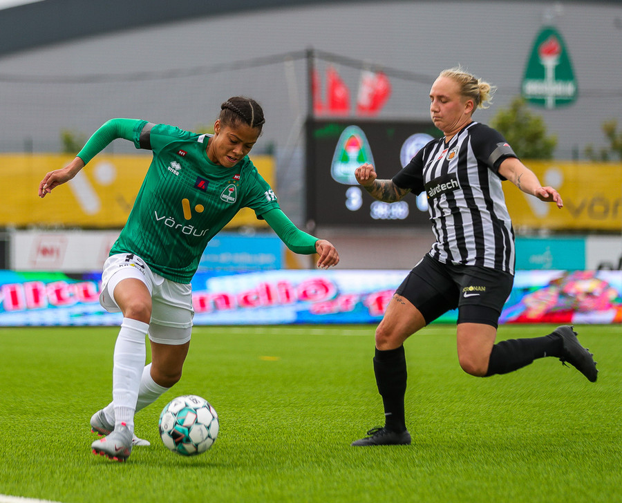 Aftur ver Ingibjörg vel. Sveindís var komin í fínan séns í teignum en Ingibjörg með góð viðbrögð og kemur í veg fyrir sjötta markið.