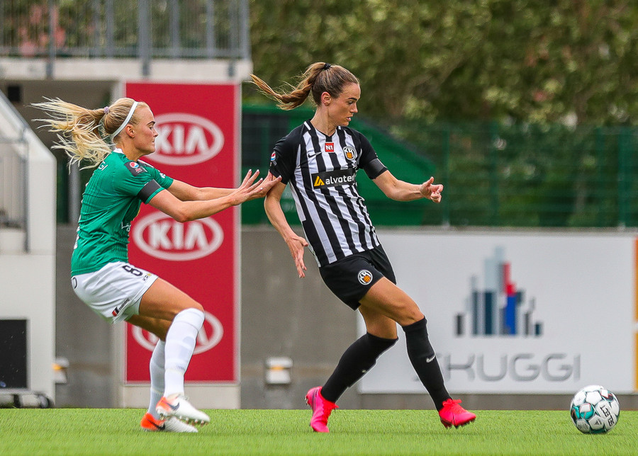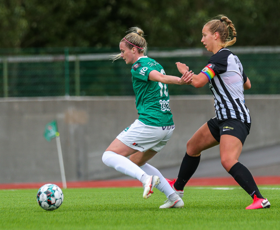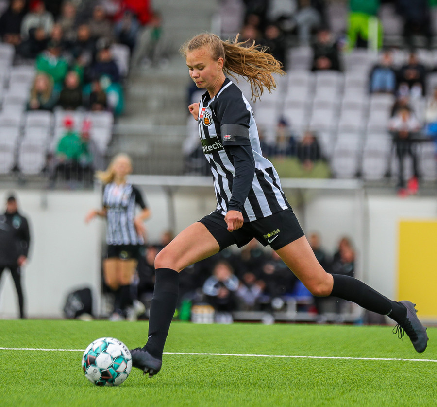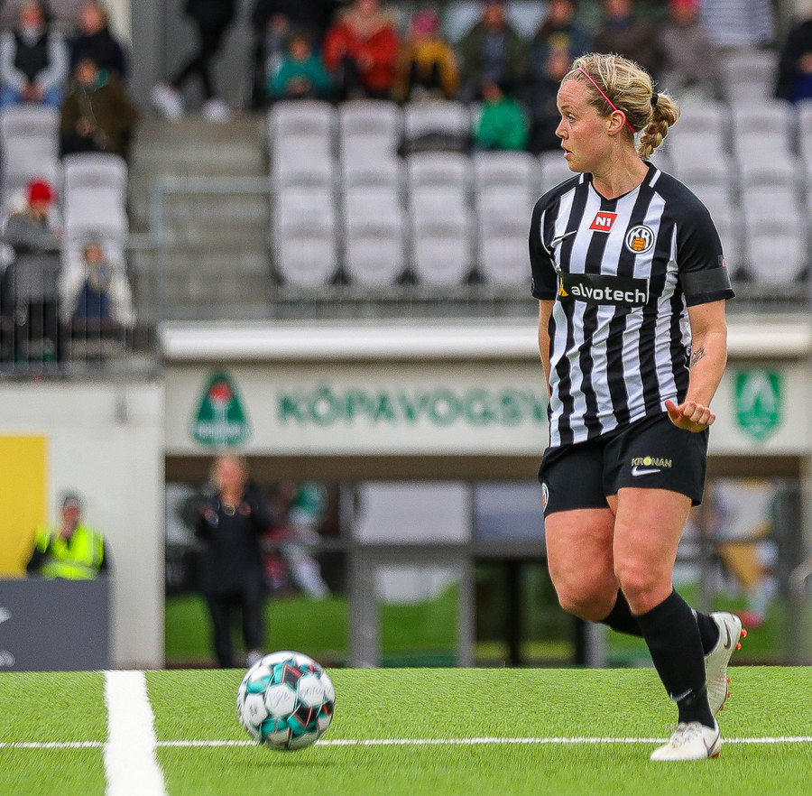 Katrín Ásbjörnsdóttir sparkar þessu í gang fyrir KR sem leikur í átt að Smáranum.