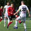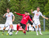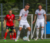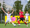 Aron Elí kemur boltanum fyrir á Andra sem reynir að leggja hann á Jason sem rétt missir af honum.
