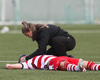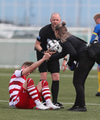 Birkir Valur liggur eftir samstuð og liðin nýta tímann meðan hlúið að að honum til að taka létta drykkjarpásu og fara yfir málin.