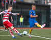 Kristófer Orri með fallegan bolta yfir varnarlínu HK á Pétur Theódór en hann nær ekki að gera sér mat úr þessu.