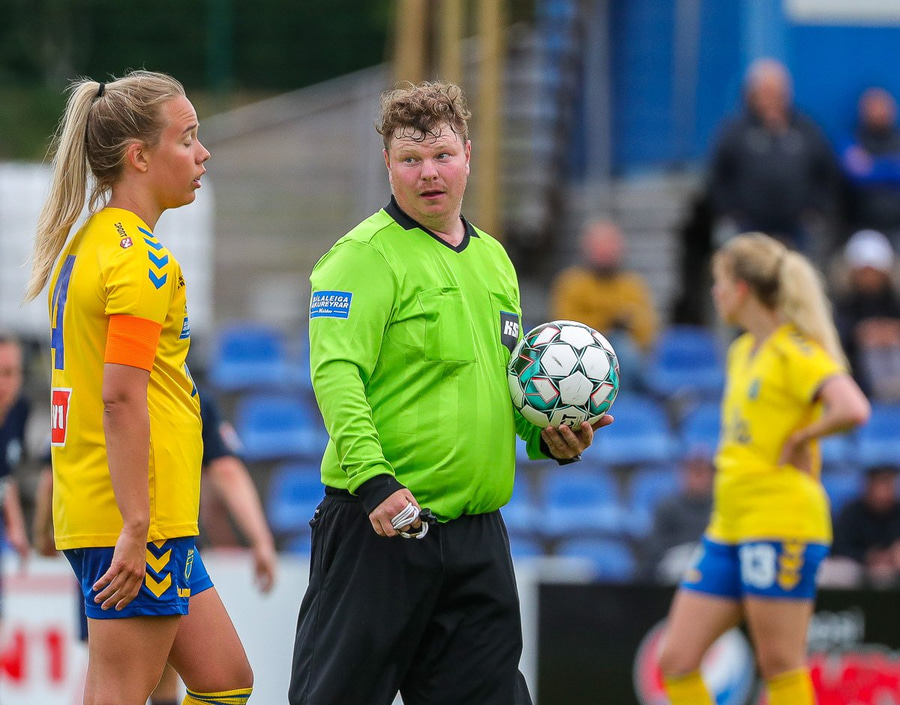 Dómarinn stoppar leikinn. Þetta var ekki þæginlegt. Elvý fær hann af stuttu færi í andlitið