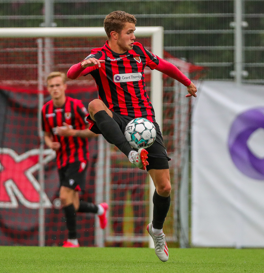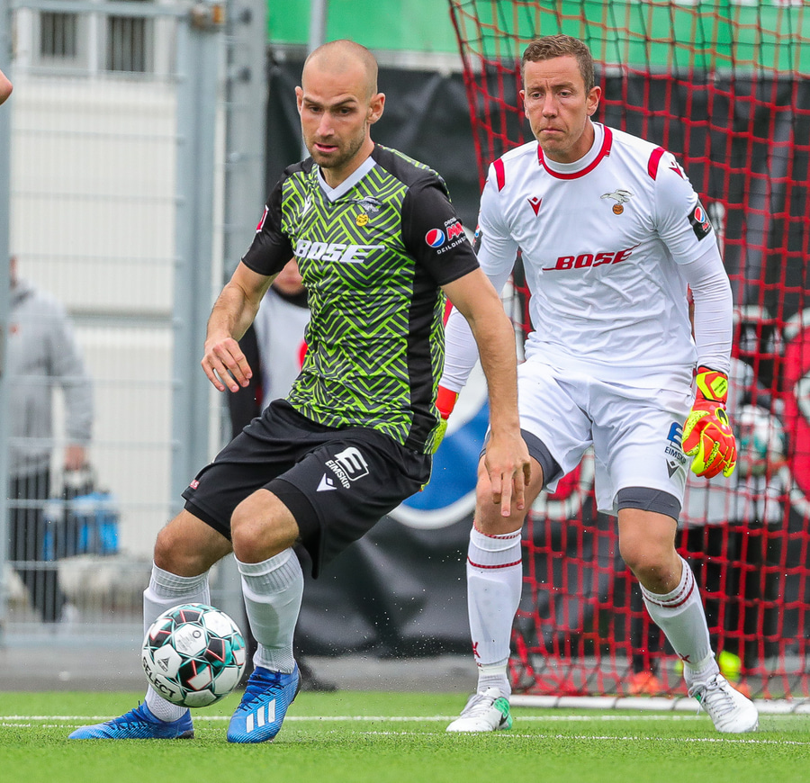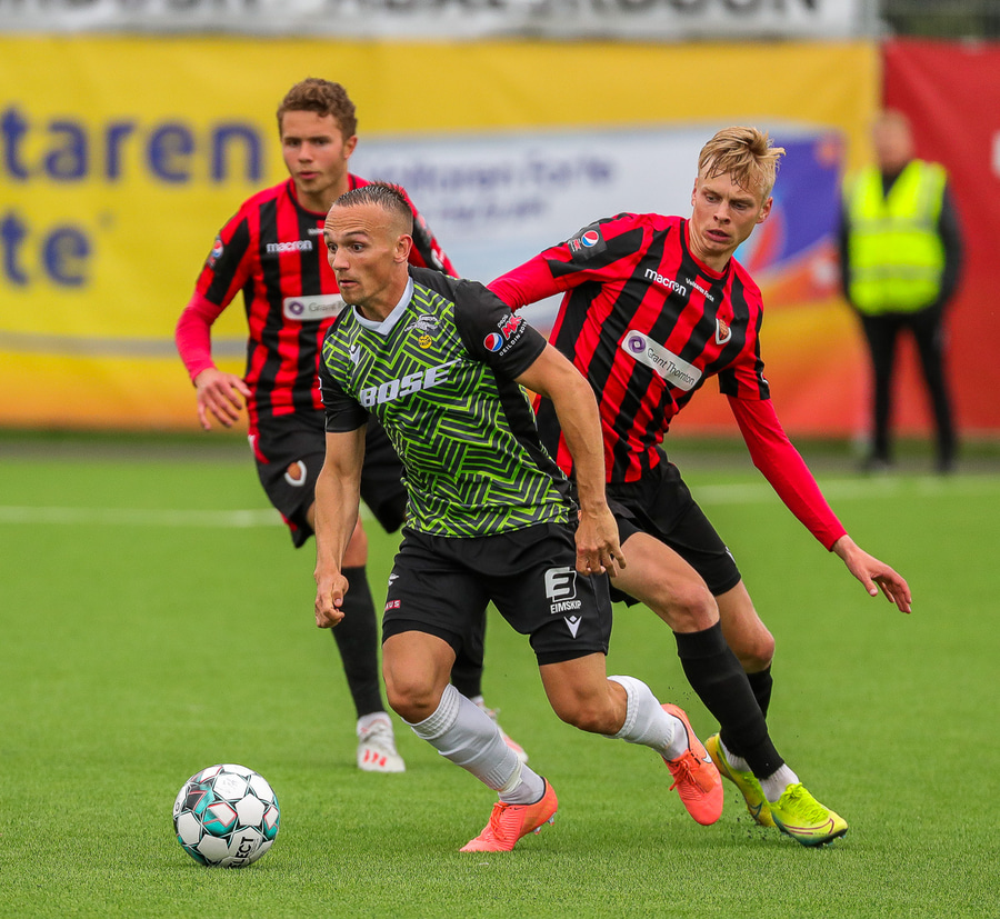 Valgeir fær allan tíman í heiminum vinstra megin og kemur boltanum á Kaj Leo sem finnur Valgeir í hálfgerðan þríhyrning og Valgeir á skot rétt fyrir utan teig og boltin lekur inn