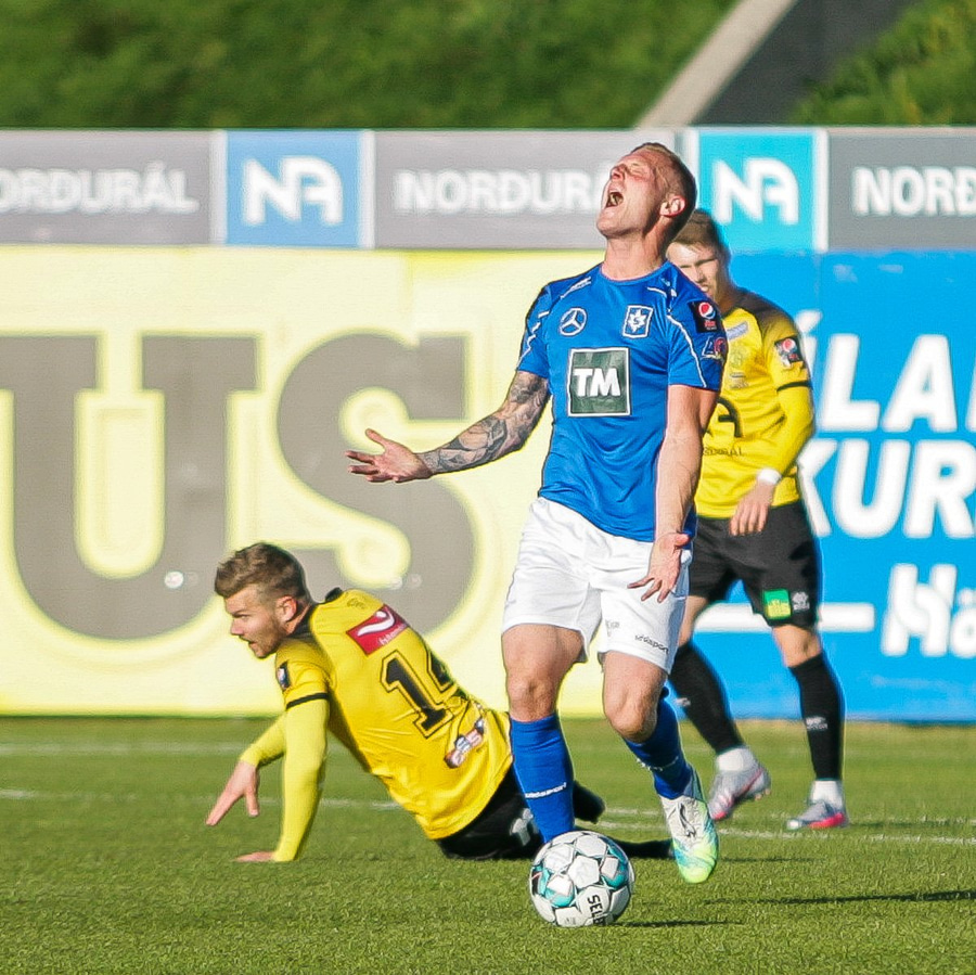 Fyrst er brotið á Stefáni Teiti en boltinn endar á Tryggva Hrafni og er hann er sparkaður niður rétt fyrir utan teig og Helgi Mikael dæmir á brotið á Stefáni Teiti eftir að hafa beitt hagnaði.