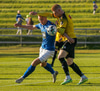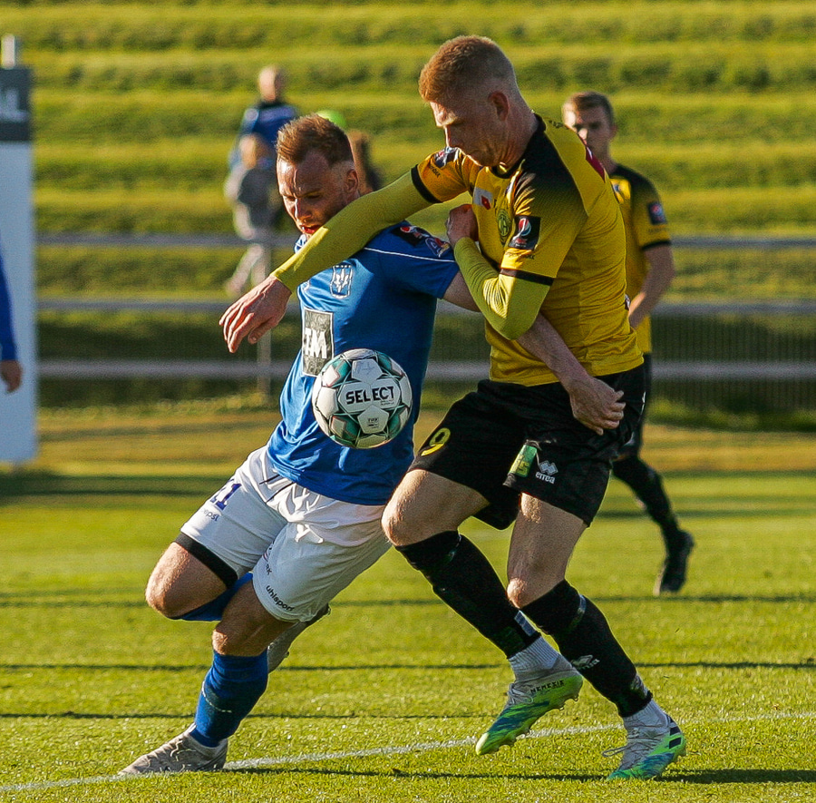 Hilmar Árni tekur hana en Stefán Teitur skallar boltan frá.