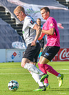 Fær sendingu til baka og bíður alltof lengi með að koma boltanum í burtu og Daníel keyrir á hann í pressuna og Aron spyrnir boltanum í Daníel og boltinn í netið.
