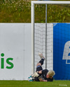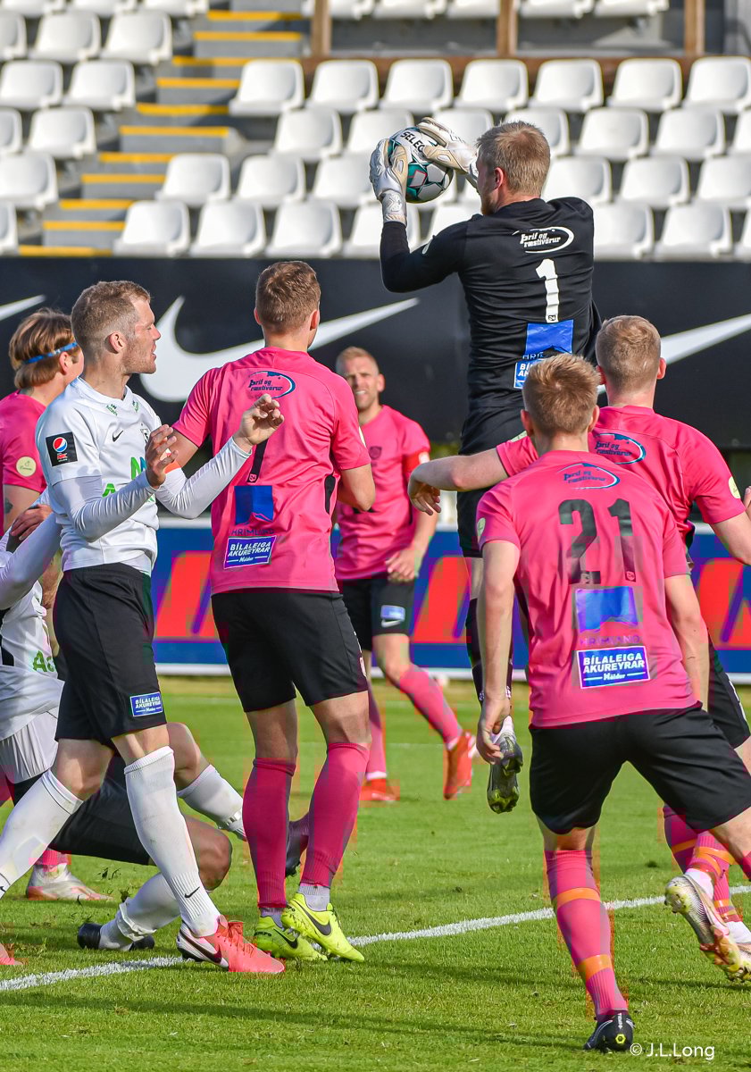 ÞÞÞ fær boltann og Hörður Ingi kemur í gott utan á hlaup og fær boltann og kemur með boltann strax fyrir og boltinn ætlaður Atla Guðna en Hemmi á undan Atla í boltann og setur boltann í horn.