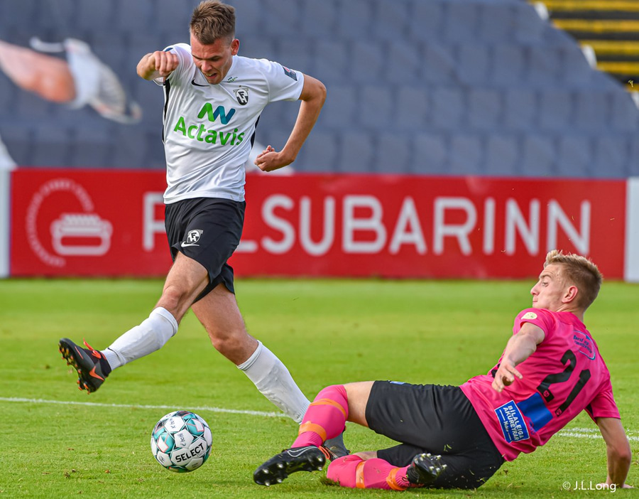 Baldur Logi með snyrtilega sendingu inn á Þóri sem er kominn einn en Elmar Þór með geggjaðan varnarleik þarna, nær að tækla boltann áður en Þórir kemst í skot og kemur í veg fyrir að Þórir nái skot á markið og boltinn af Þóri og afturfyrir.