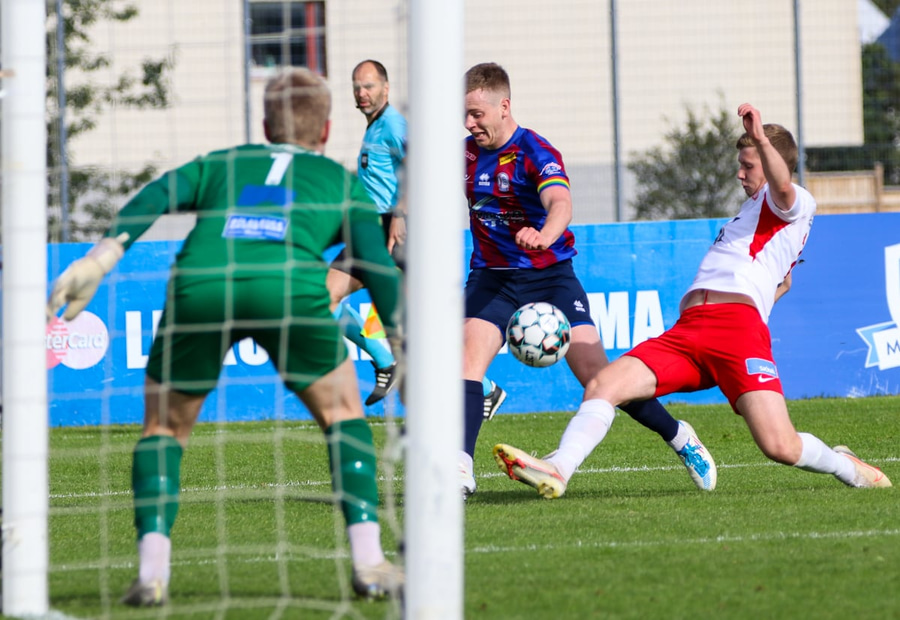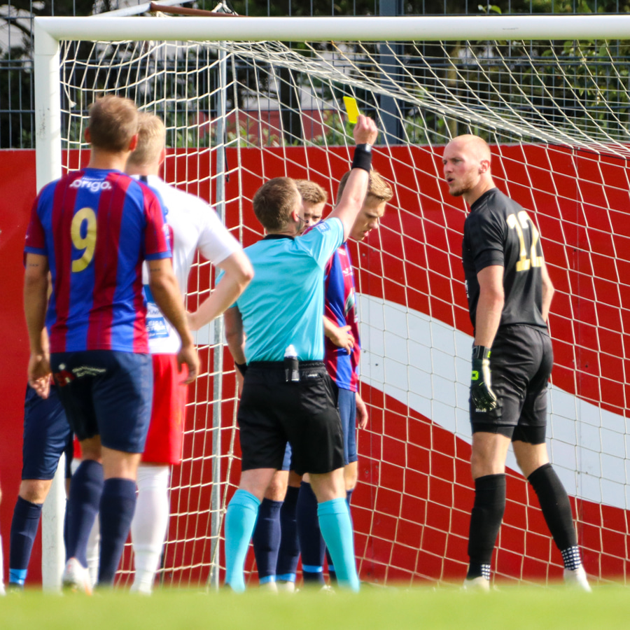 Boltinn inn á teiginn, Guðni sendir boltann framhjá Guy sem fer í Guðna. Seinna gula?