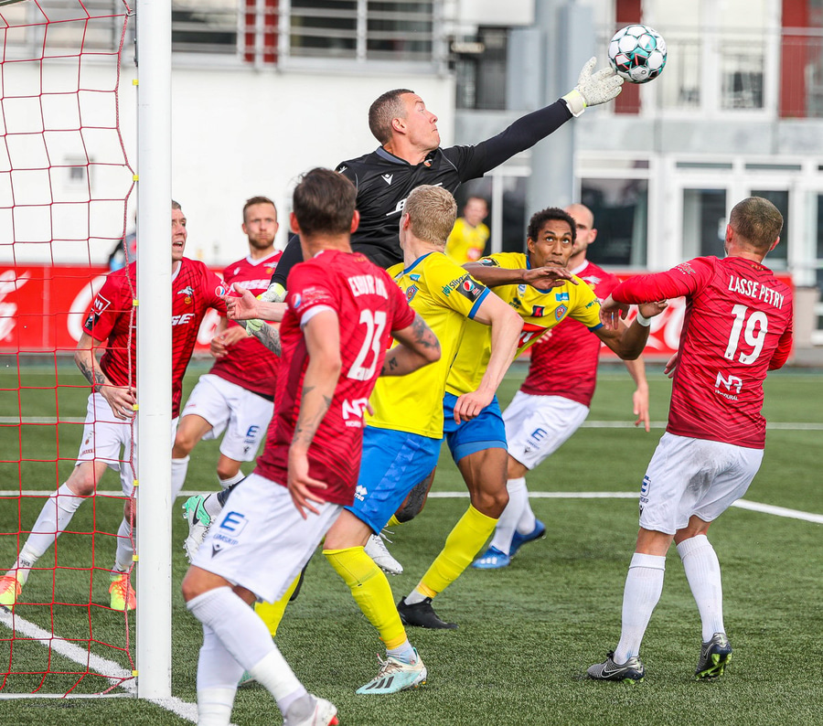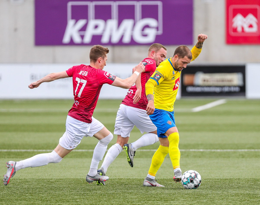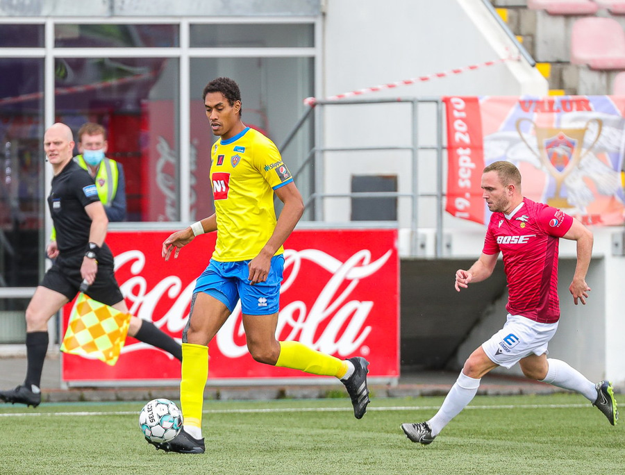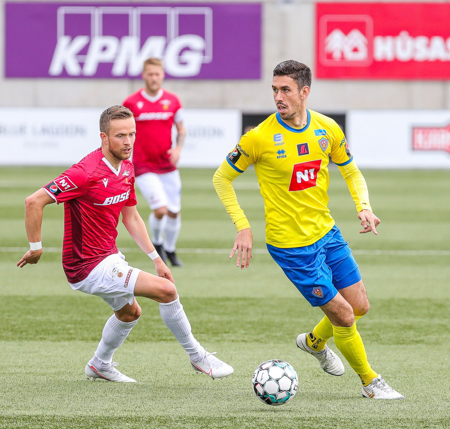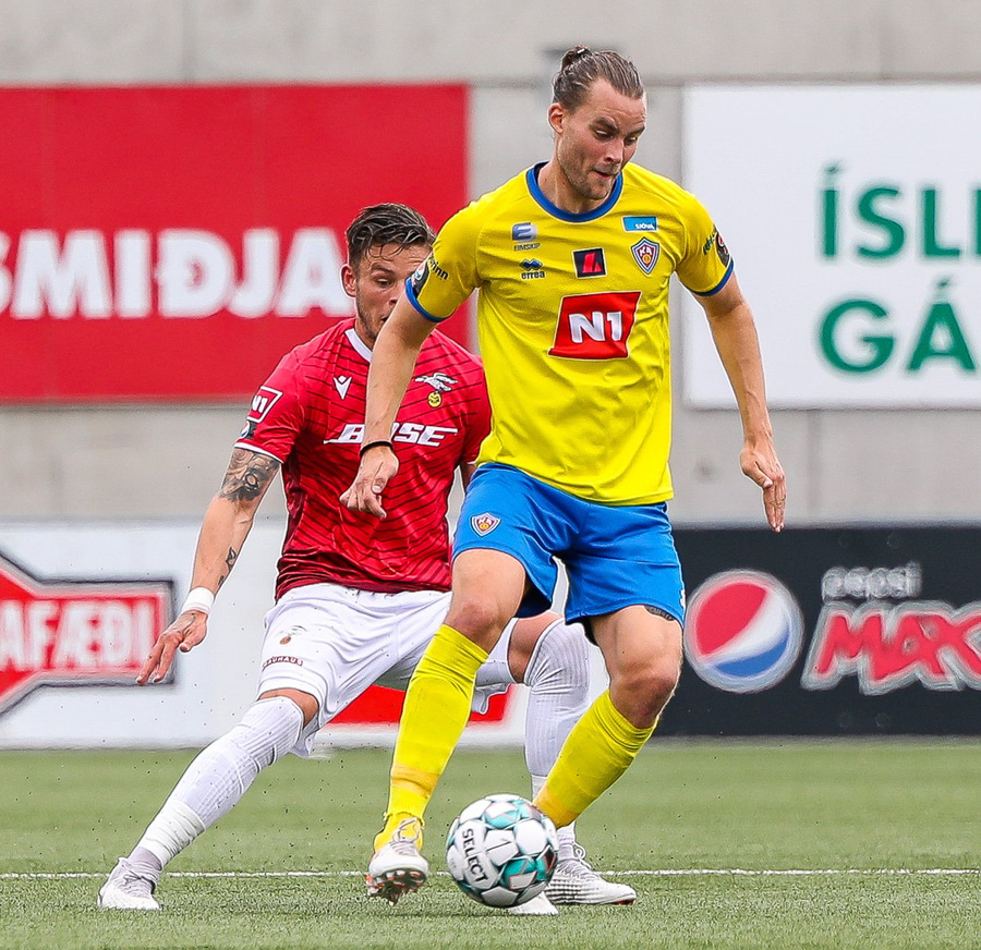 Aron enn að gera gestunum lífið leitt, kemst framhjá Ívari og neglir inní en Mateo kemur boltanum frá á síðustu stundu.