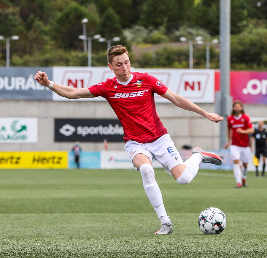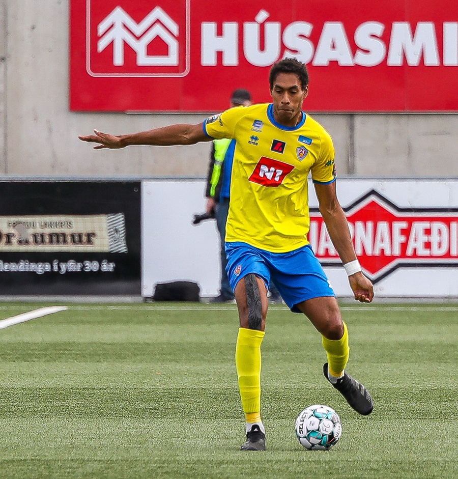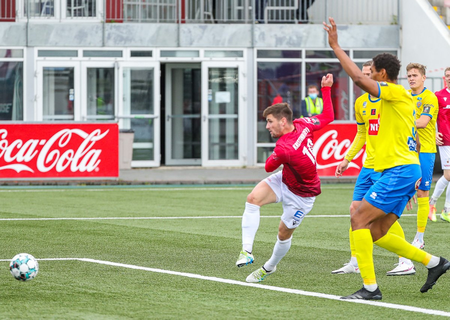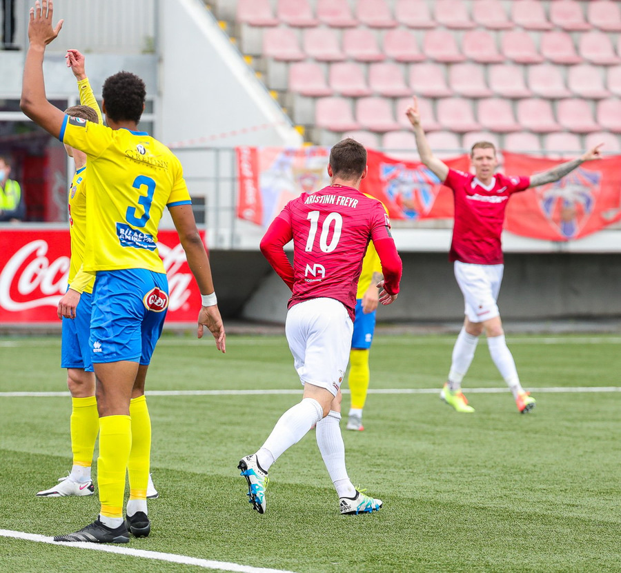 Kaj Leó fær fína sendingu frá Sigurði inn í teiginn og hann neglir að marki.