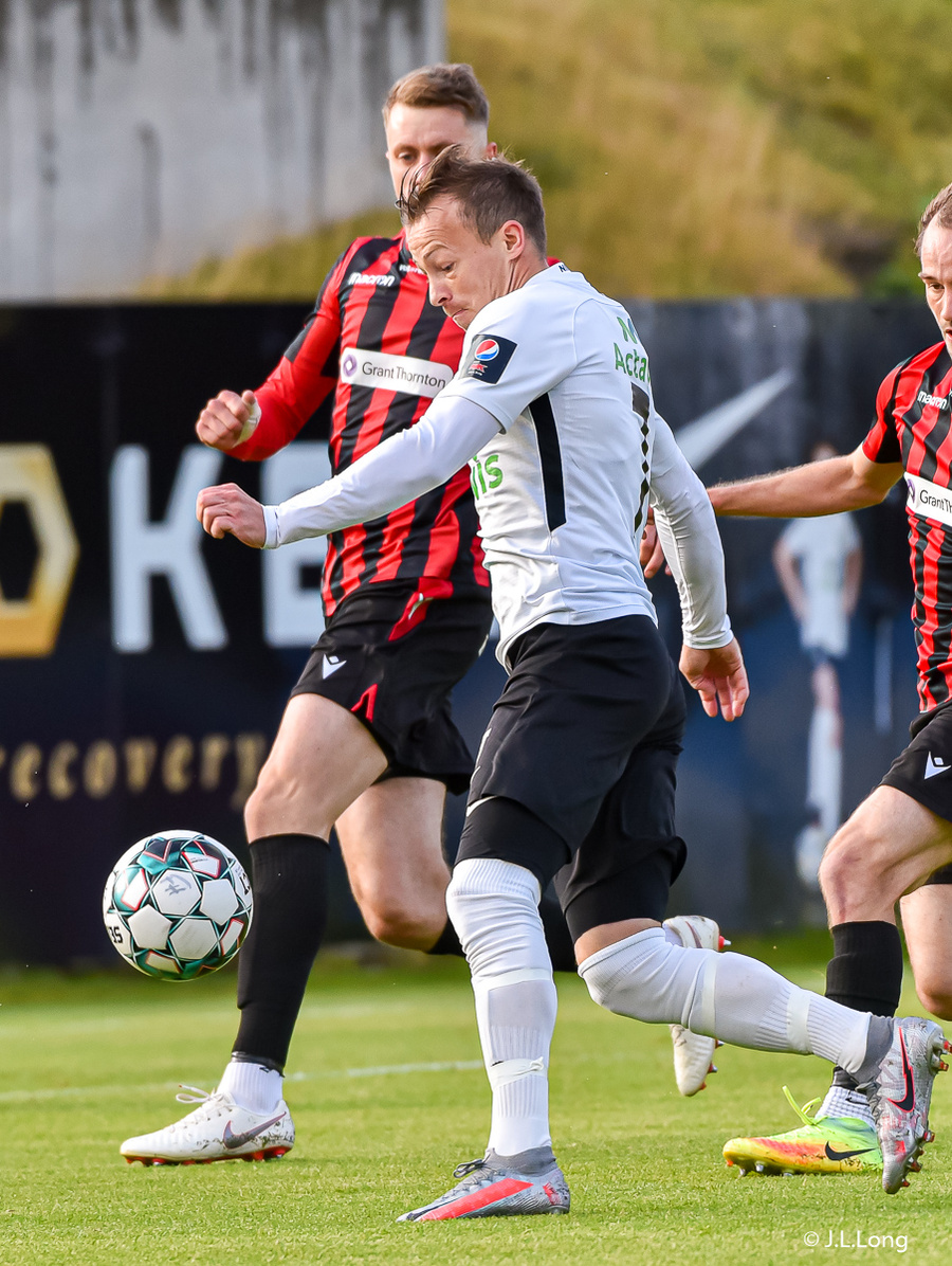Halldór Jón fær boltann hér hægra meginn og keyrir af stað og kemur með fastan bolta inn á hættusvæðið og þar var Nikolaj mættur en hann hittir ekki boltann og boltinn afturfyrir.
