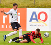 Adam Ægir fær boltann vinstra meginn og kemur með góða fyrirgjöf en þar er Guðman mættur og tæklar boltann í horn.