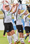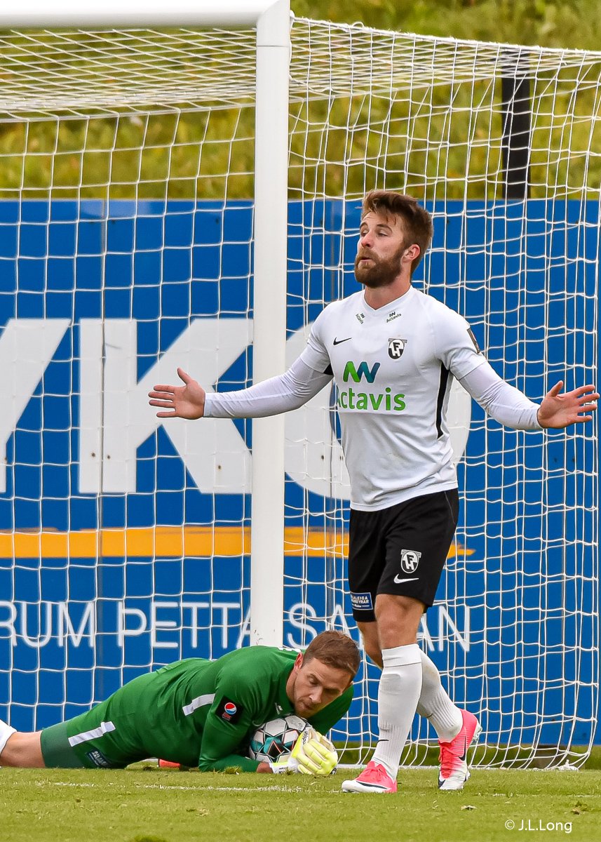 Boltinn er þræddur innfyrir á Lennon sem rennir boltanum til hliðar á Atla Guðna sem rennir boltanum í autt markið en flaggið á loft. Steven Lennon flaggaður fyrir innan.