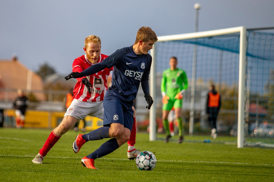 Davíð Snær við það að sleppa í gegn en Guðmundur Friðriks með fína tæklingu og boltinn í horn.