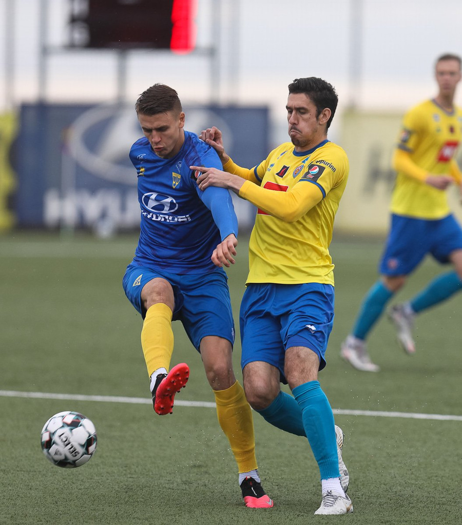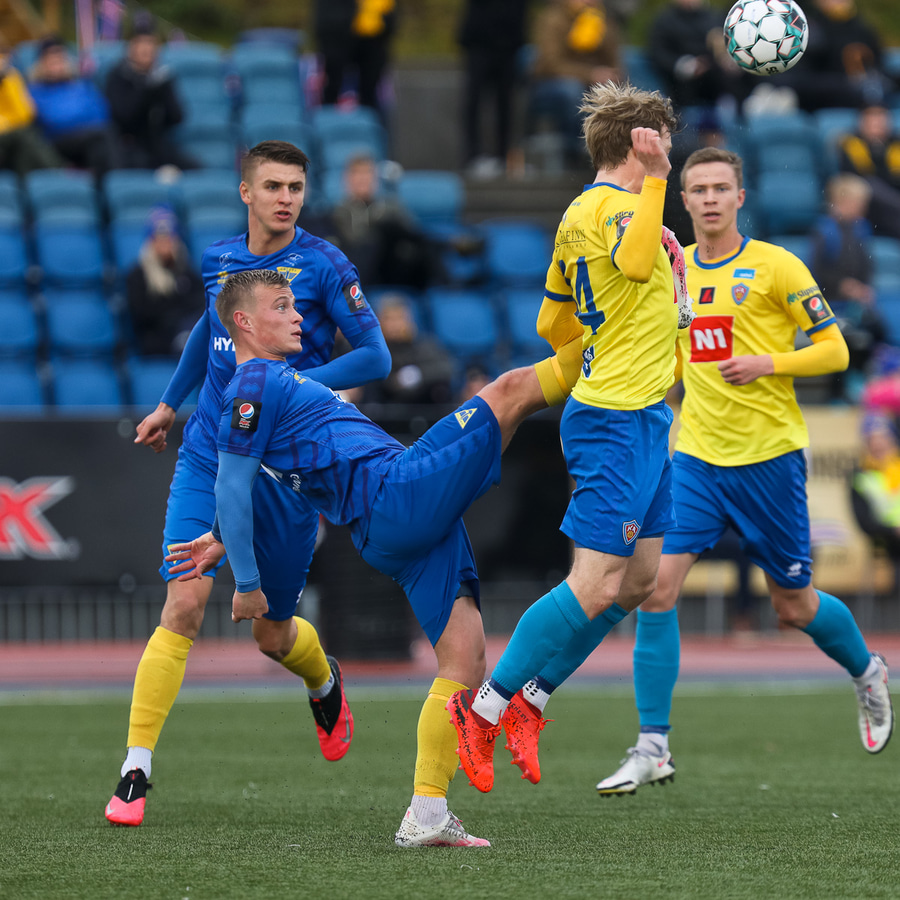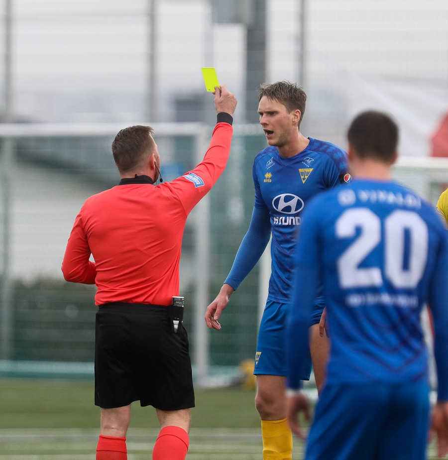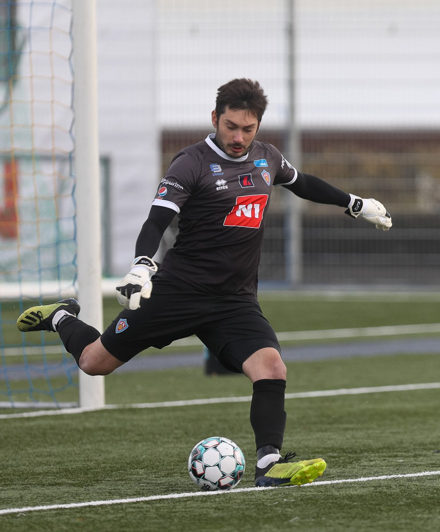 Grímsi lyftir boltanum inn fyrir á Gumma Stein sem kemst með boltann inn á teiginn og Hákon Rafn keyrir á móti Gumma og er dæmdur brotlegur.