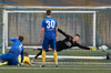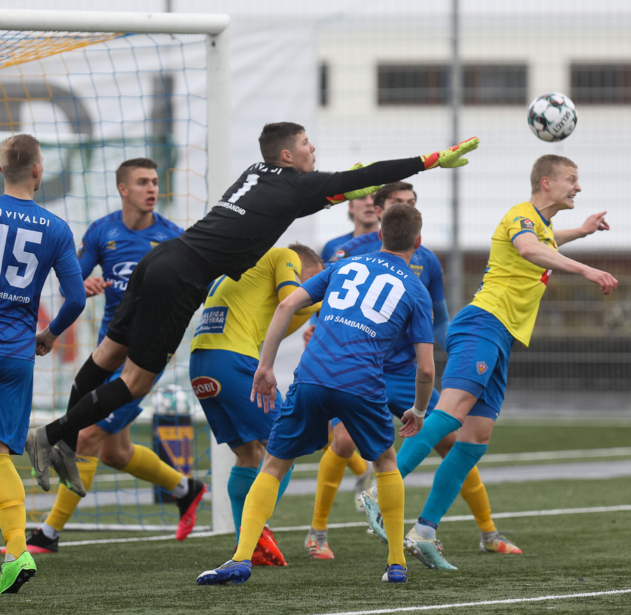 Setur boltann fastan í vinstra hornið og Hákon Rafn skutlar sér í rétt horn en skotið fast.