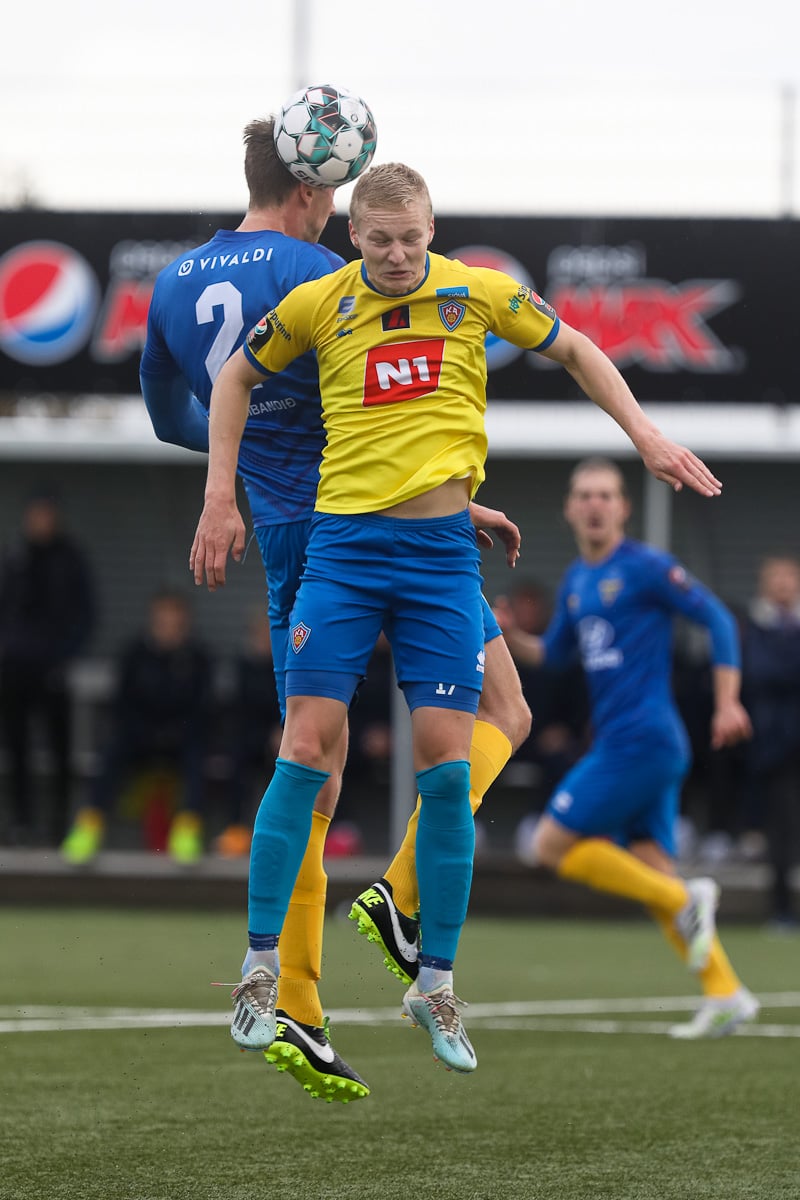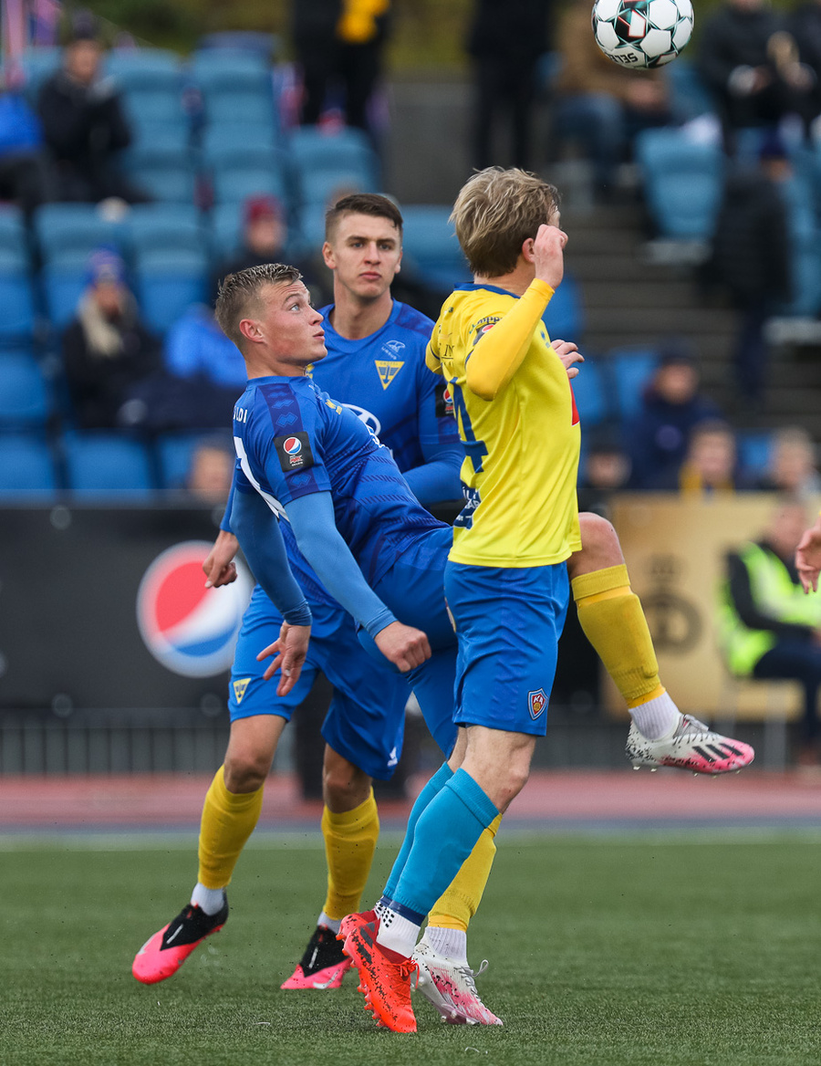 Nökkvi Þeyr liggur hér eftir og virðist sárþjáður. Vonandi að Nökkvi geti haldið leik hér áfram.