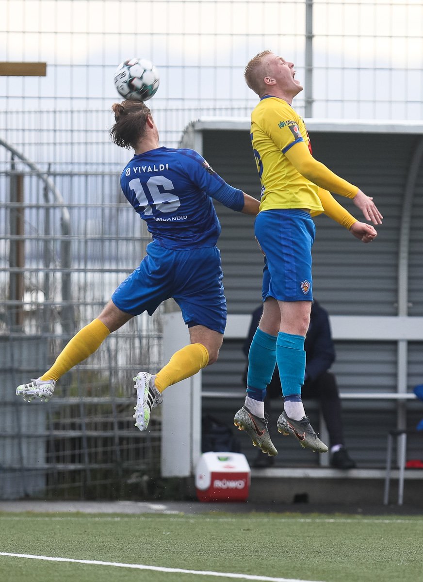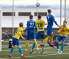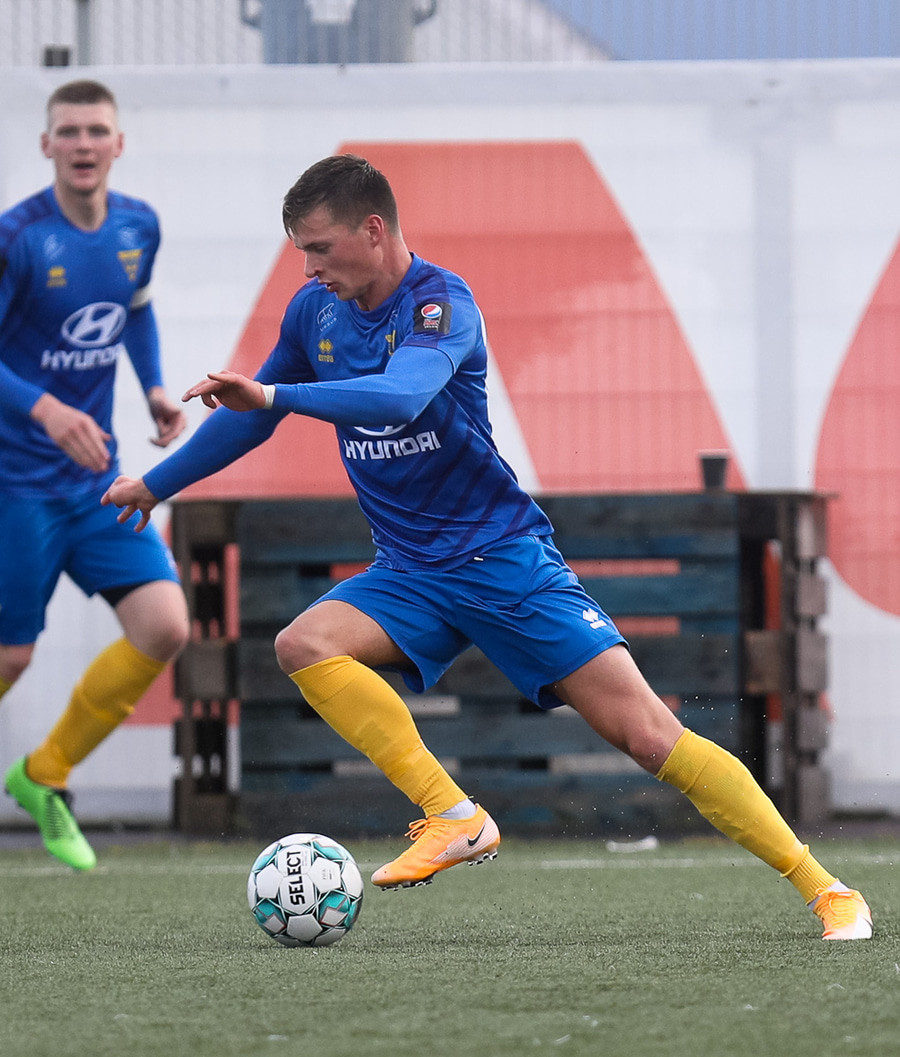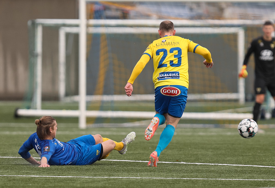 Brynjar Ingi með langa spyrnu ætlaða Ásgeiri Sigurgeirs sem var við það að sleppa í gegn en flaggið á loft.