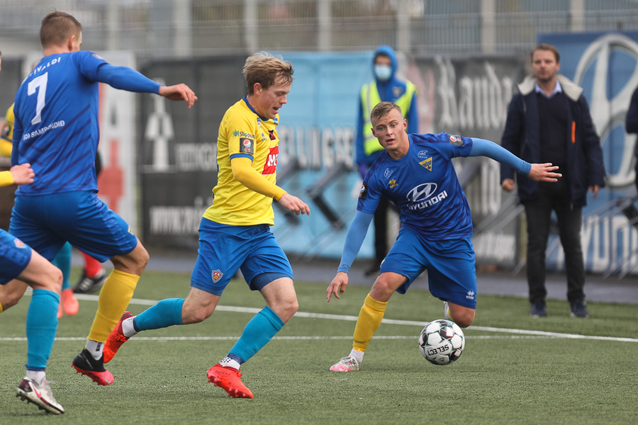 Bjarni Aðalsteinsson finnur Ásgeir út til vinstri og Geiri kemur með boltann fyrir ætlaðan Nökkva en boltinn í gegnum allan pakkann.