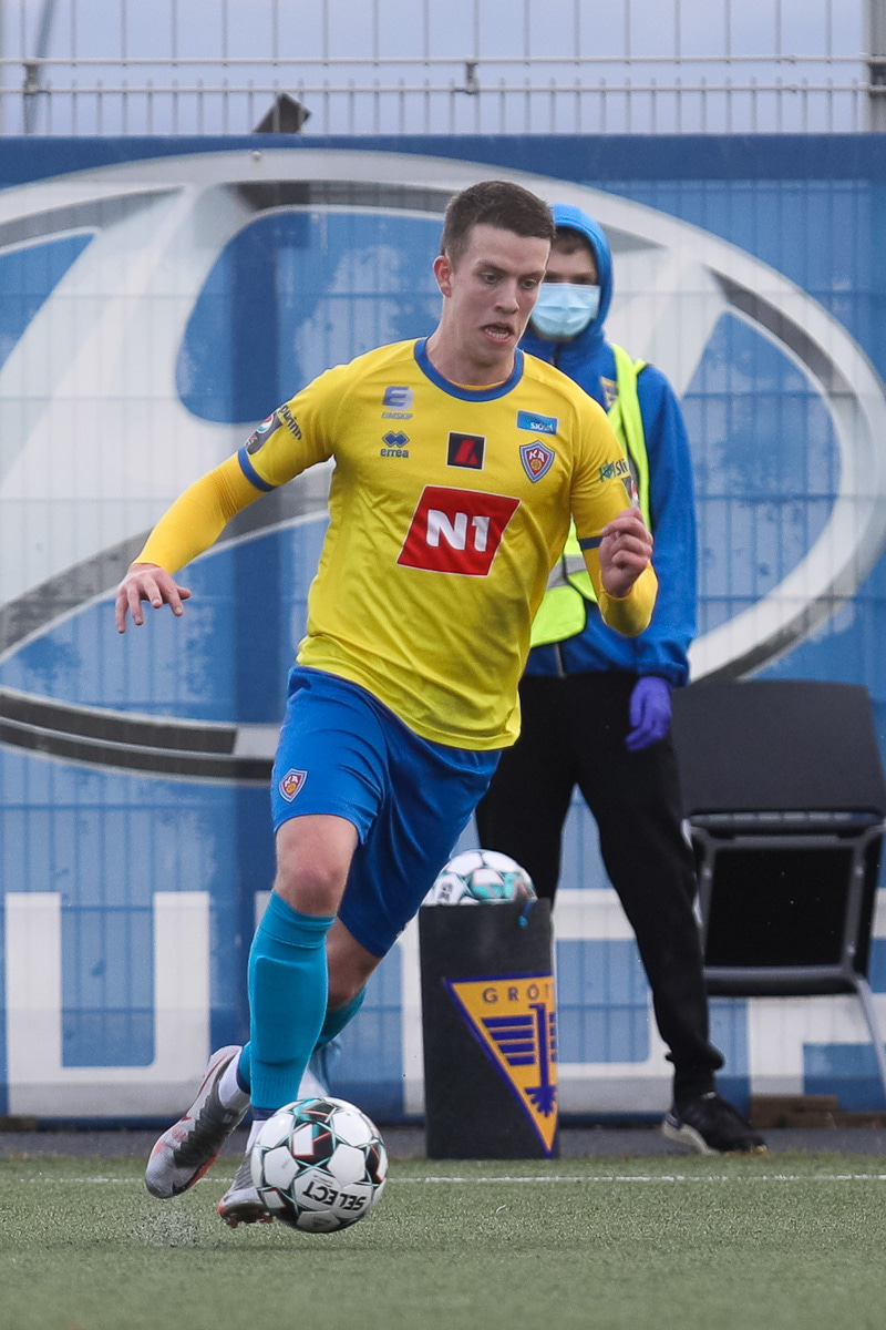 Fær boltann fyrir utan teig Gróttu og lætur vaða en boltinn beint á Hákon Rafn!