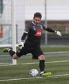 Bjarni Aðalsteinsson tekur spyrnuna og lyftir honum inn á teig en boltinn beint í fangið á Hákoni.
