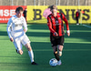 Slök sending í varnarlínu Keflavíkur. Niko Hansen nær boltanum en Frans tekur hann niður. Klárt gult.