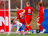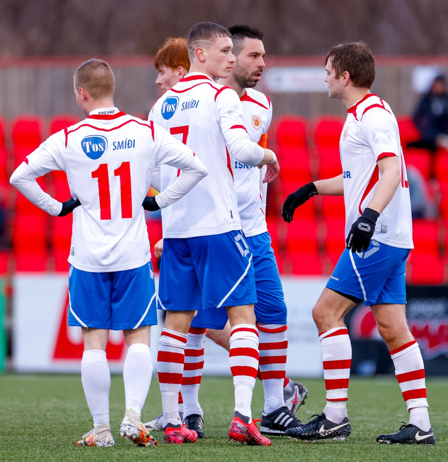Hælar hann í markið eftir skot frá Magnúsi, skotið kom eftir hornspyrnu og var tekið hægra megin fyrir utan teig.