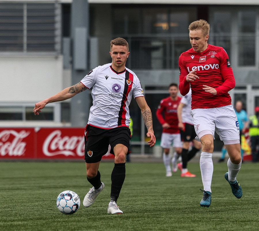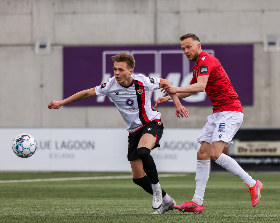 Viktor Örlygur fær boltann við miðjuhringinn og lyftirboltanum skemmtilega fyrir á Nikolaj sem nær ekki til boltans og Hannes Þór grípur boltann.
