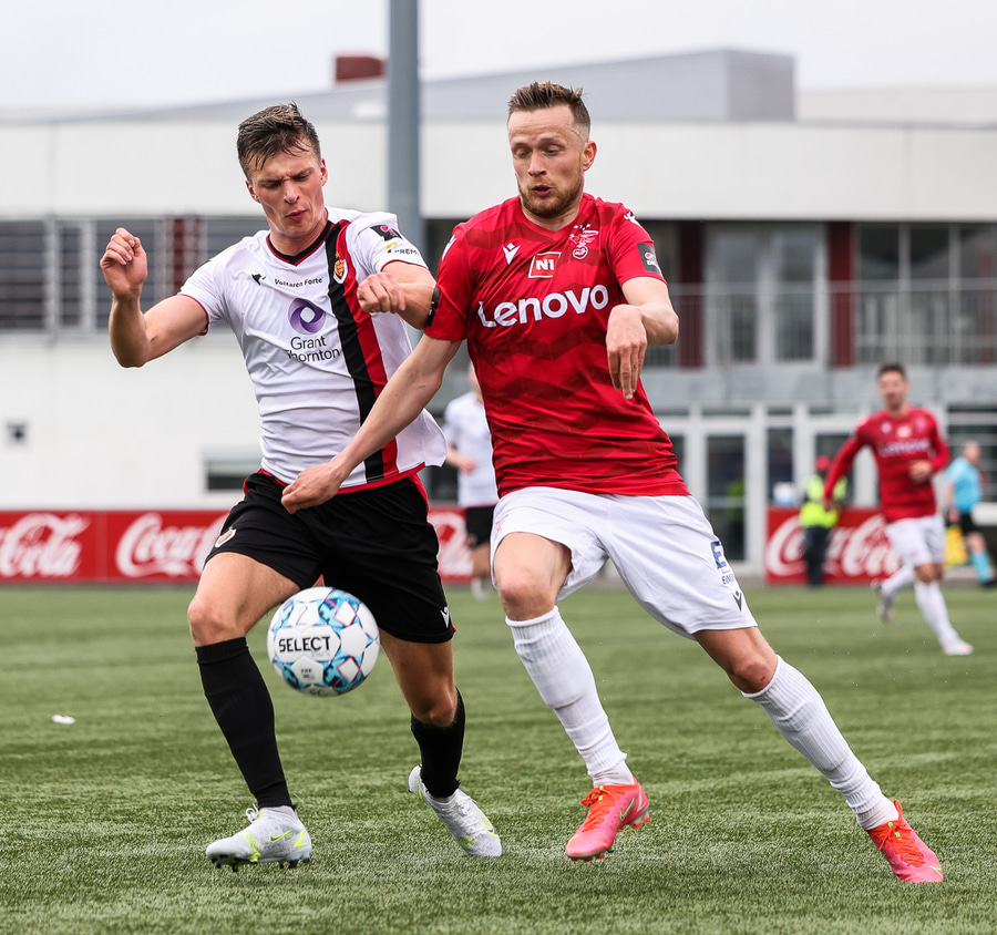 Rasmus lyftir boltanum inn fyrir á Sigga Lár og Þórður kemur á ferðinni og ætlar að koma boltanum í burtu en mistekst það og Siggi Lár kemst í boltann en Þórður Ingason klippir hann niður.