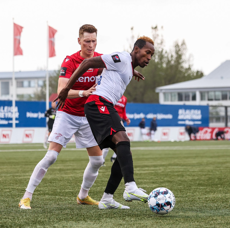 Kwame leikur inn á völlinn og kemur boltanum yfir á Karl Friðleif sem finnur Helga Guðjónsson sem nær ekki stjórn á boltanum og boltinn á Hannes.