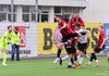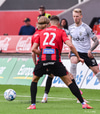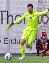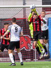 Pablo með sendingu sem var ætluð Nikolaj en Gunnar kemur á réttum tíma út úr markinu og handsamar knöttinn.