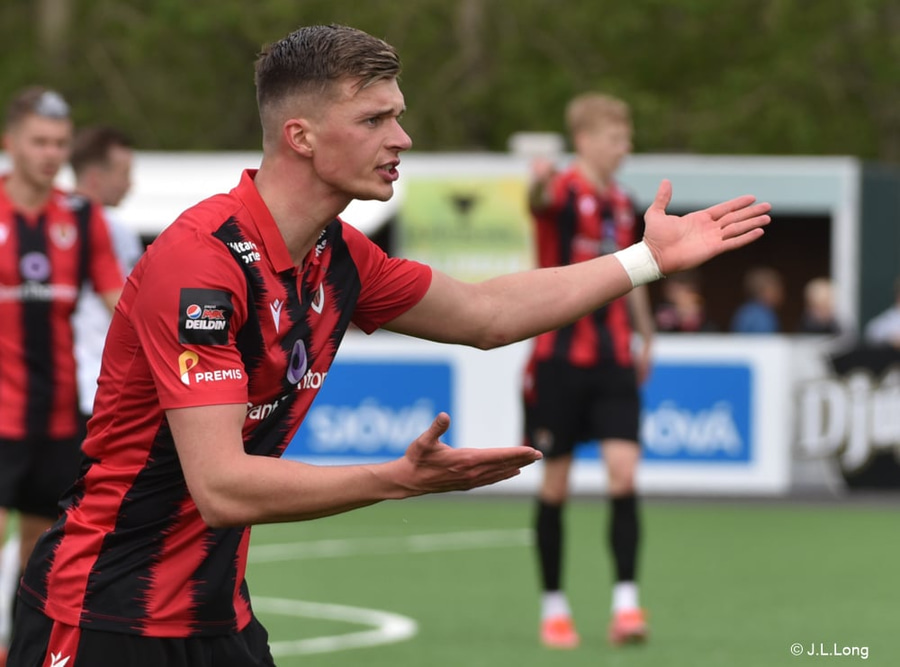 Braut á Ágústi Hlyns. Örfáum mínútum á undan bað Karl Friðleifur um gult spjald á Ágúst þegar þeir voru að eigast við en varð ekki að ósk sinni. Er ansi pirraður yfir þessu spjaldi!