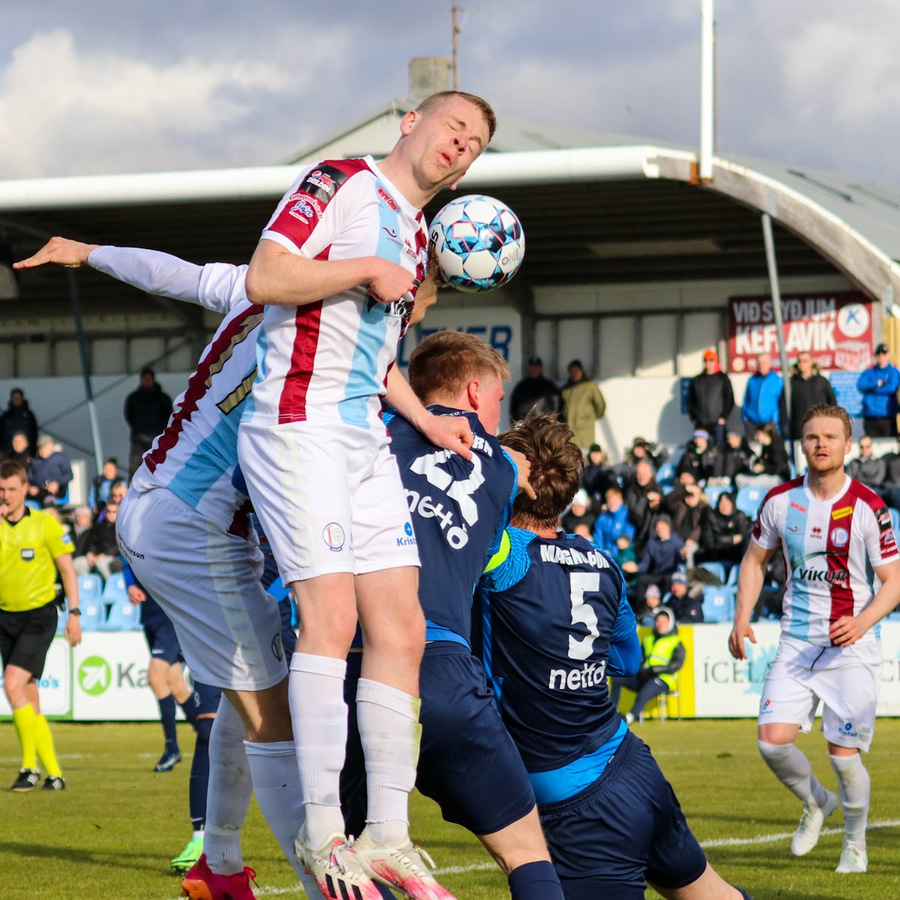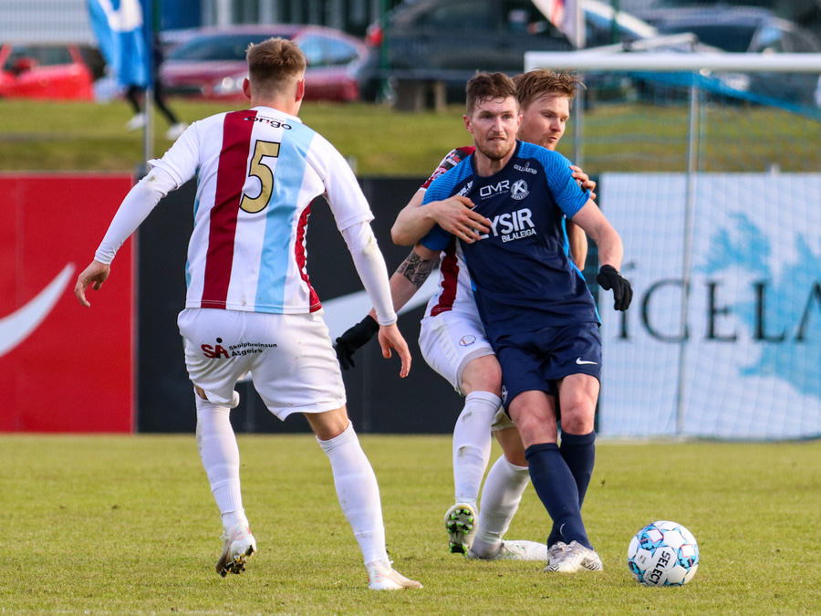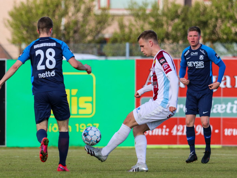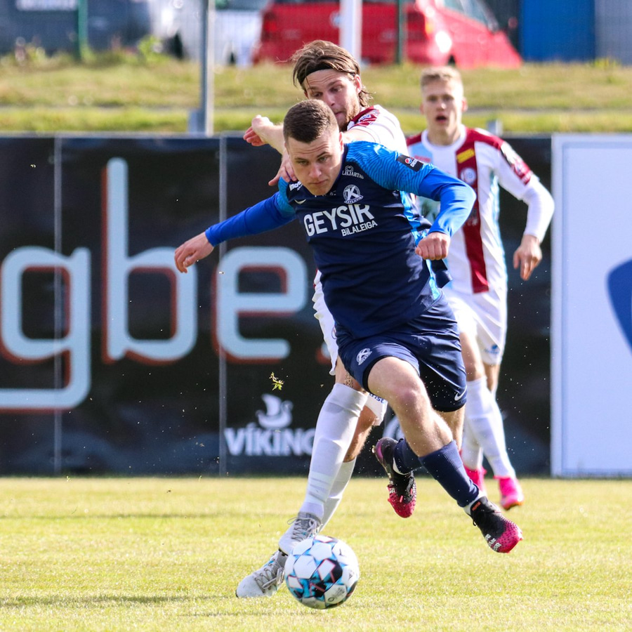 Sævar Atli með geggjaða móttöku í teignum en missir svo boltann frá sér. Einhverjir kalla eftir peysutogi en það var aldrei inn í myndinni ef eitthvað var hélt Sævar í Nacho.