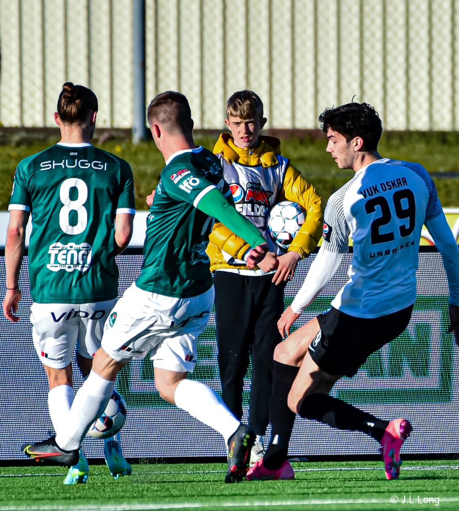 Höskuldur sendir í átt að Viktori sem lætur boltann fara, boltinn endar hjá Kidda sem finnur Viktor Karl í teignum, Viktor á fast skot sem fer í Eggert Gunnþór og þaðan yfir Gunnar í markinu og inn fór boltinn!!
