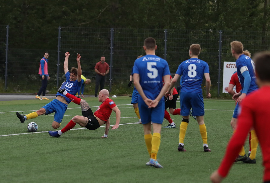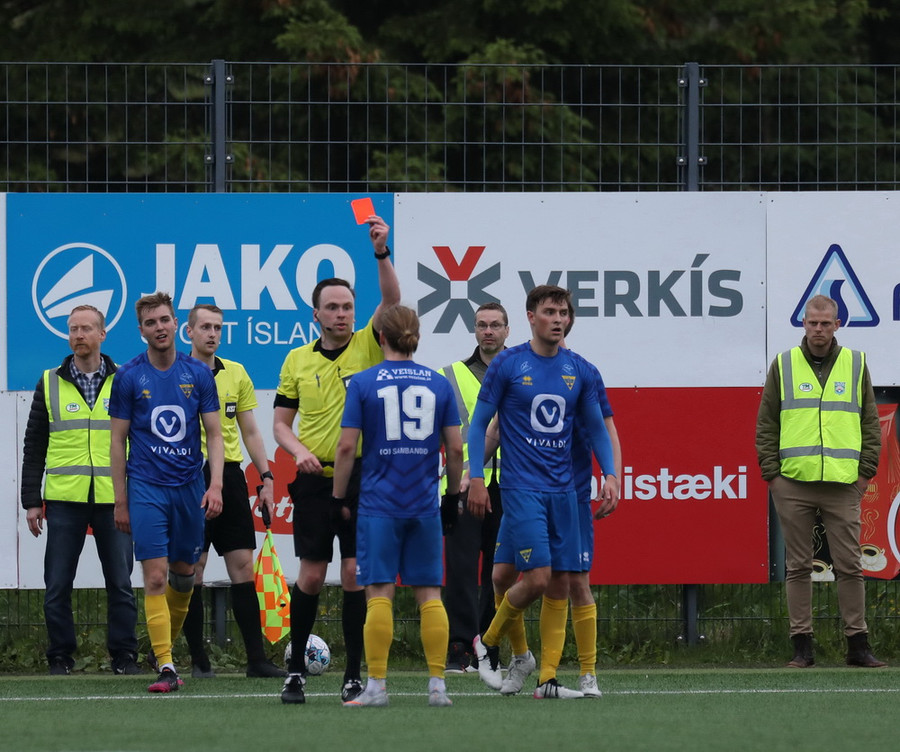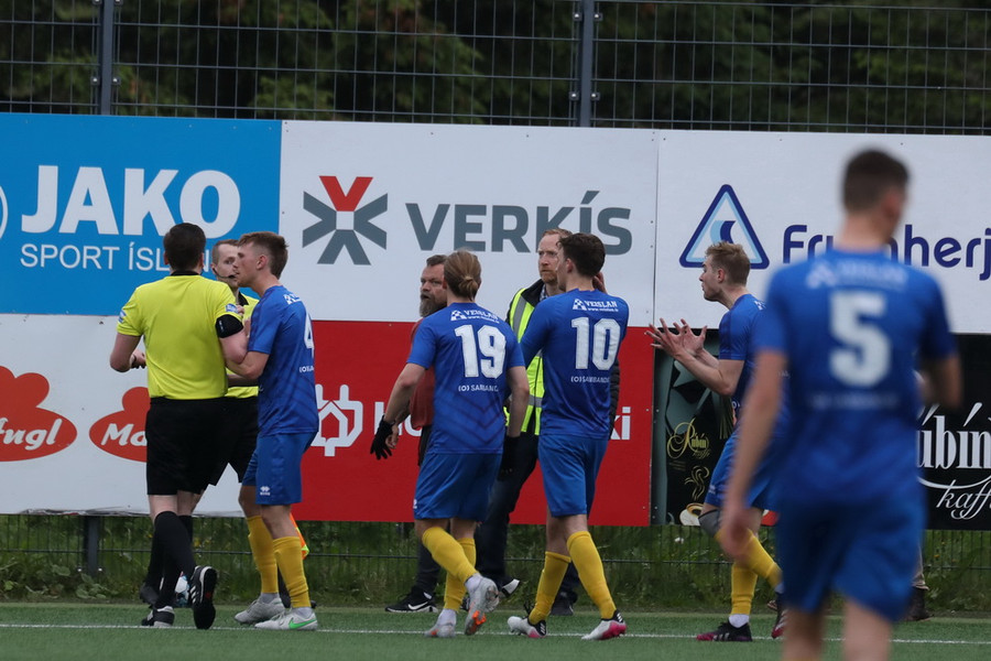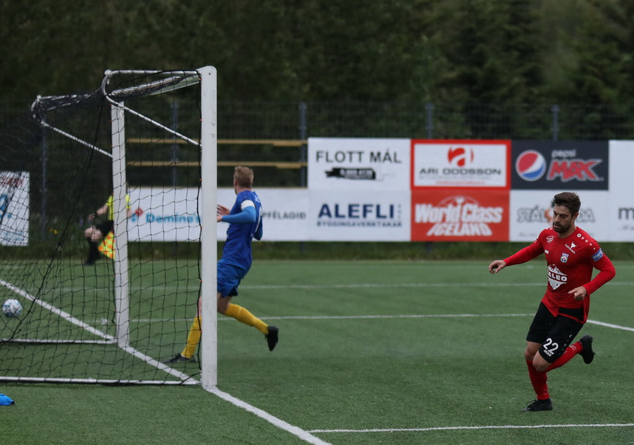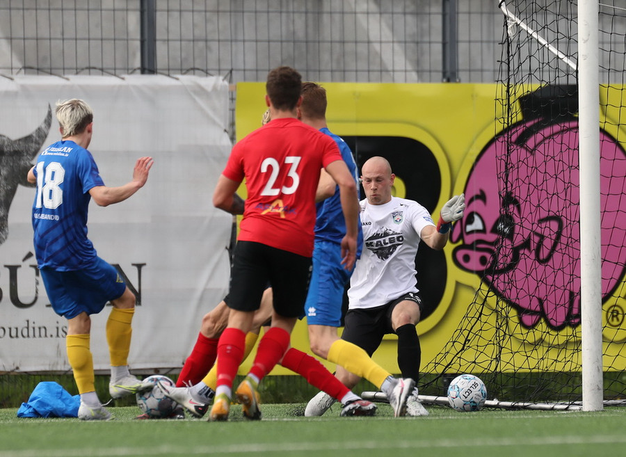 Heimamenn skora eftir hornspyrnu en Arnar Ingi dómari leiksins dæmir brot í teignum. Markið telur ekki.