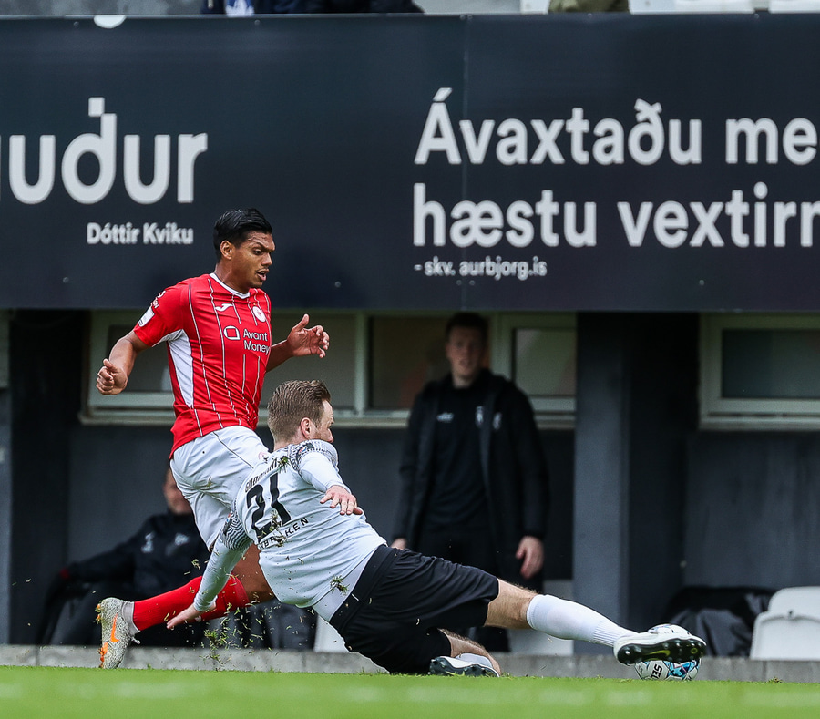 Þórir Jóhann með aukaspyrnuna inn á teiginn en gestirnir ná að skalla boltanum til hliðar. Á vinstri kantinum er Hörður Ingi og hann á fyrirgjö sem fer í hendurnar á Mcnicholas.