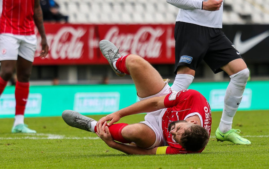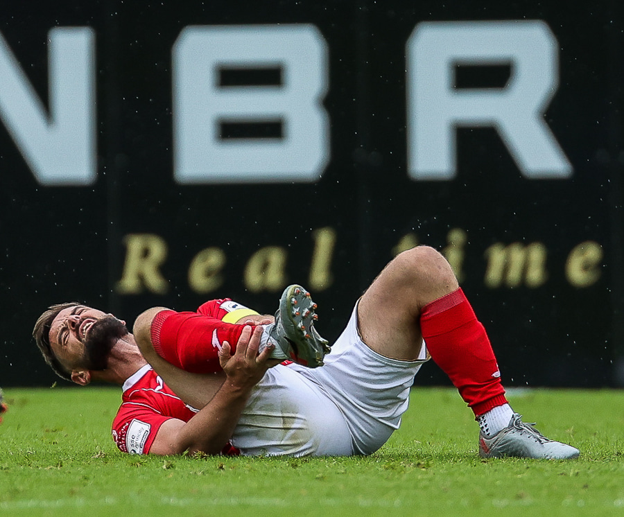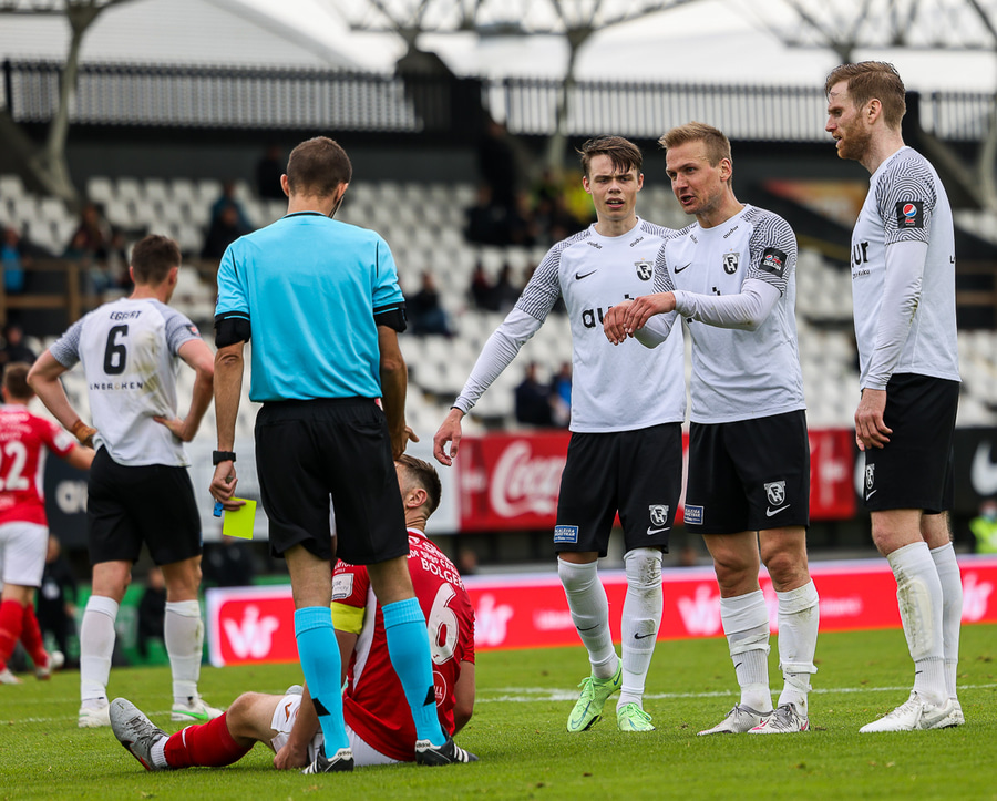 Eggert fékk eitthvað högg á höndina og þurfti að yfirgefa völlinn í smá stund. Hann er kominn aftur inn á.