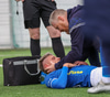 Tryggvi Snær Geirsson er leggstur niður og virðist vera fara af velli.