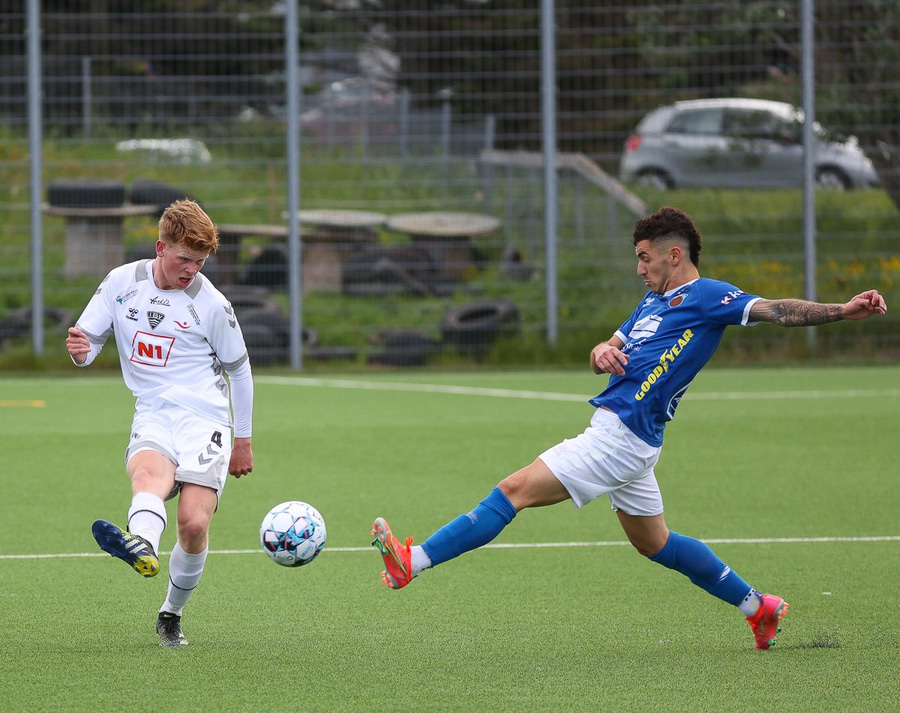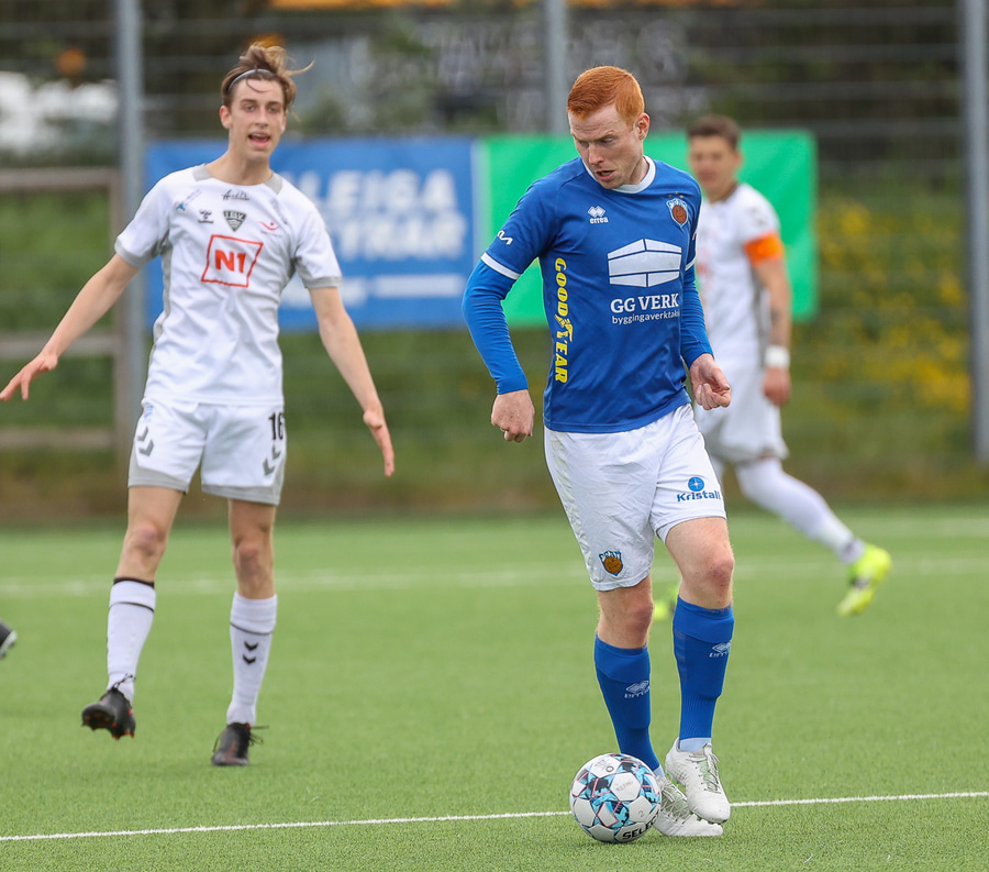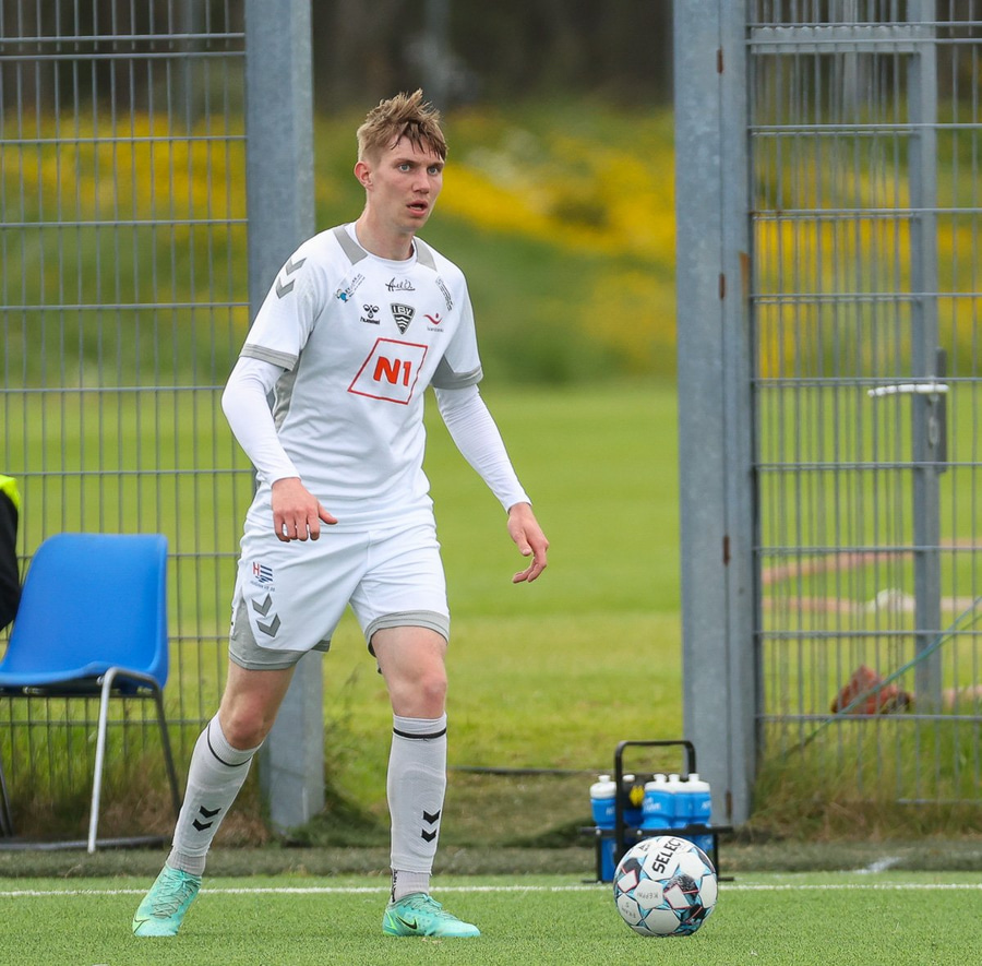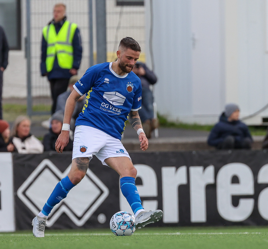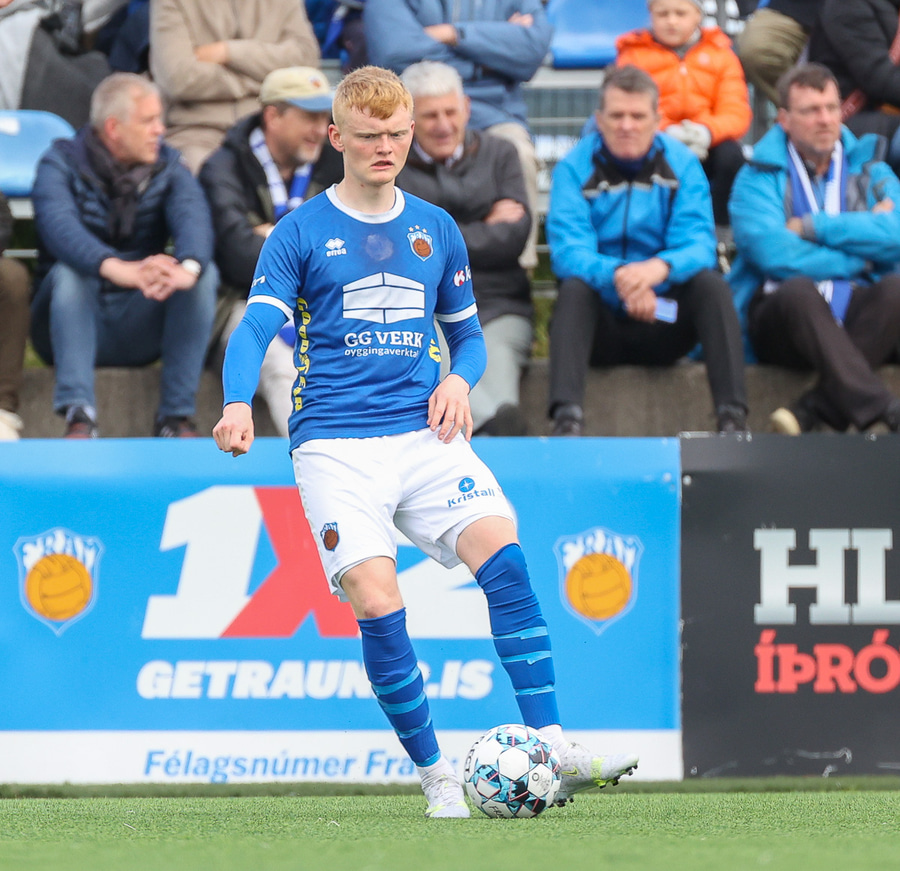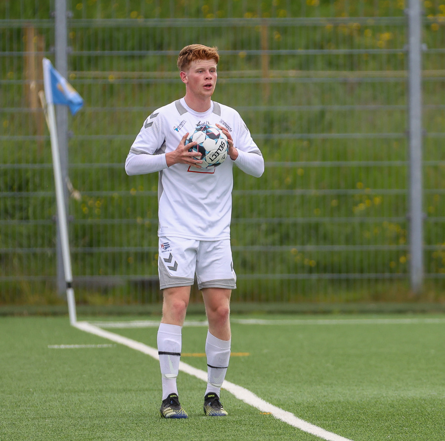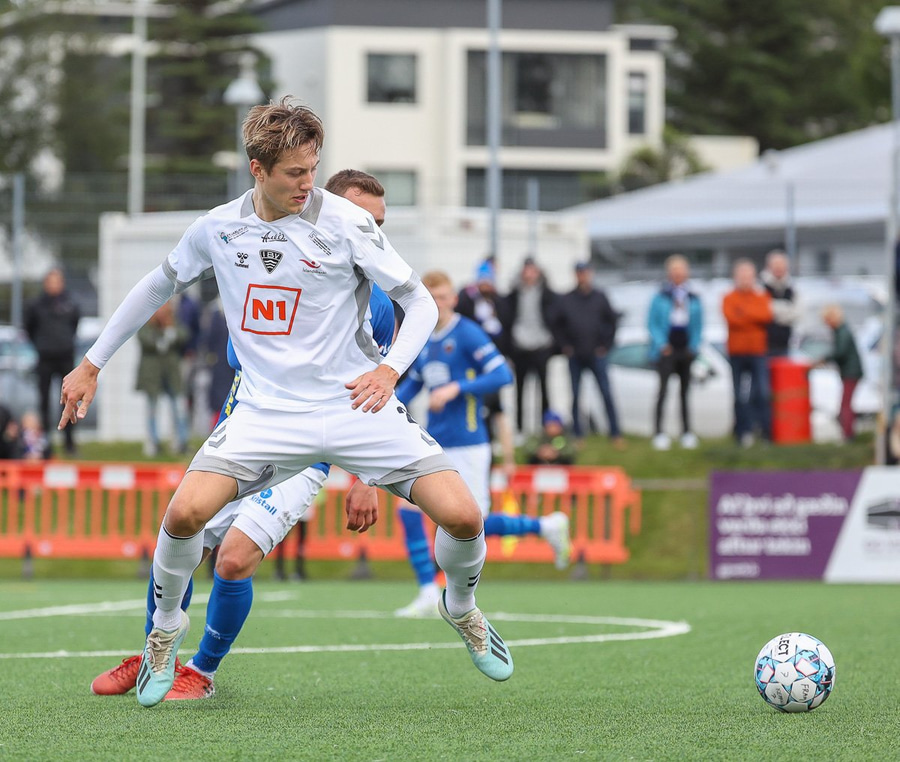 Nökkvi ætlar að senda inn í teig en boltinn ratar ekki lengra en í höfuðið á Alex Frey sem liggur svo eftir.