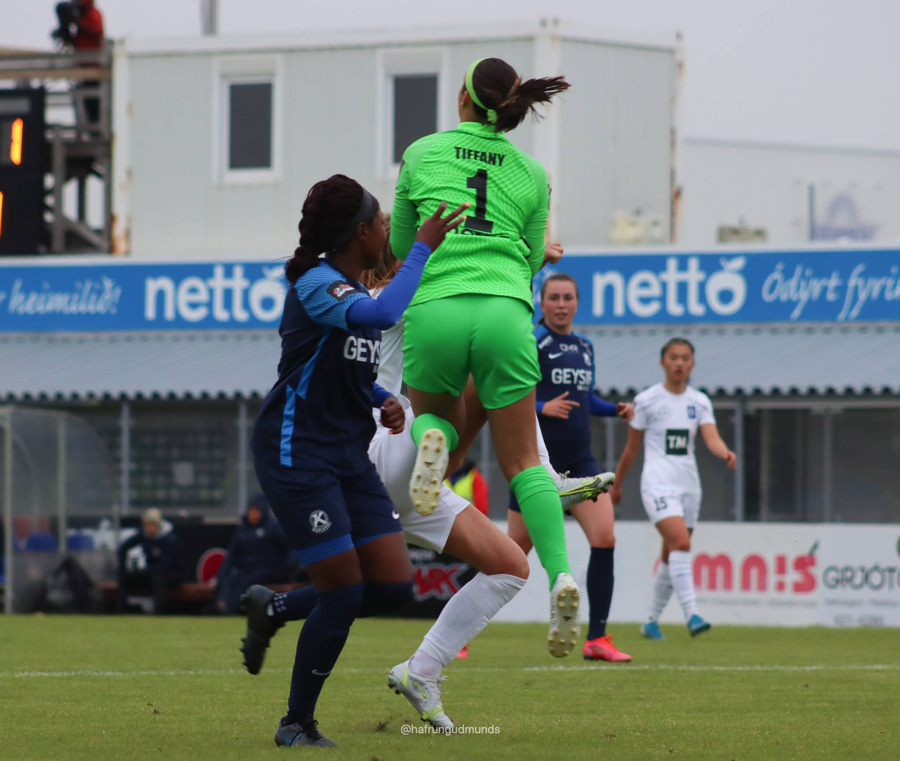 Boltinn berst leikmanna á milli og endar hjá Úlfu sem á skot fyrir utan vítateig. Tiffany heldur ekki skotinu og boltinn dettur fyrir Örnu Dís sem skilar boltanum í netið!