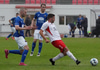 Tæklar Albert á miðjunni sem var á leið í skyndisókn.