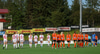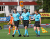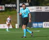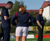 Vökvunarkerfið að slá í gegn. Búið að vökva sóknarhelming Fylkis vel. Dómararnir og Valskonur hlaupa undan gusunni.